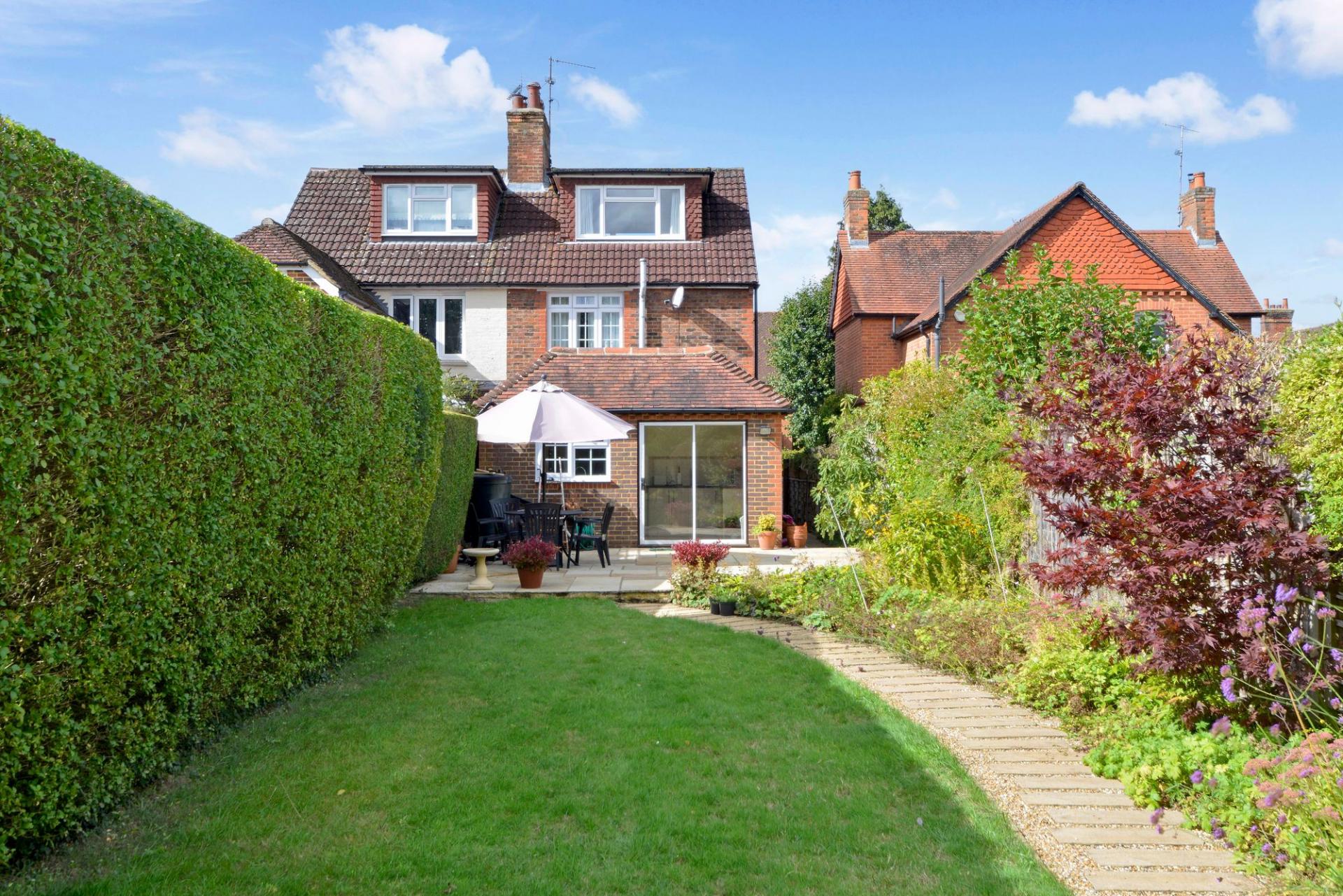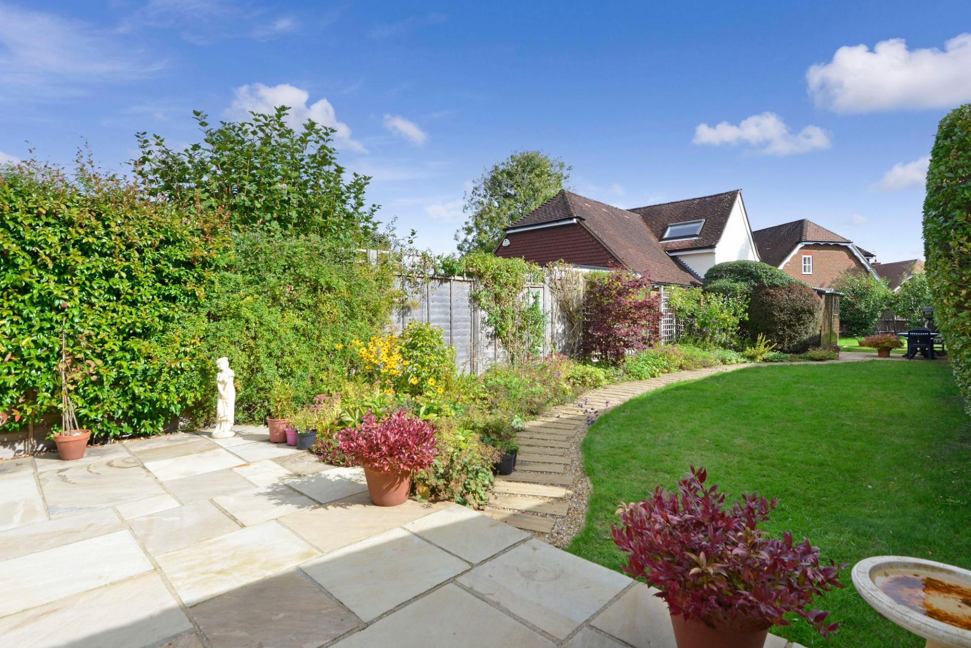 Outside, the beautifully maintained garden is a true sanctuary. A paved patio area provides the perfect setting for al fresco dining. Beyond, a winding path meanders through lush greenery and vibrant planting, bordered by established hedges for privacy and tranquillity. Whether hosting summer gatherings or enjoying a quiet morning coffee, this garden elevates everyday living.