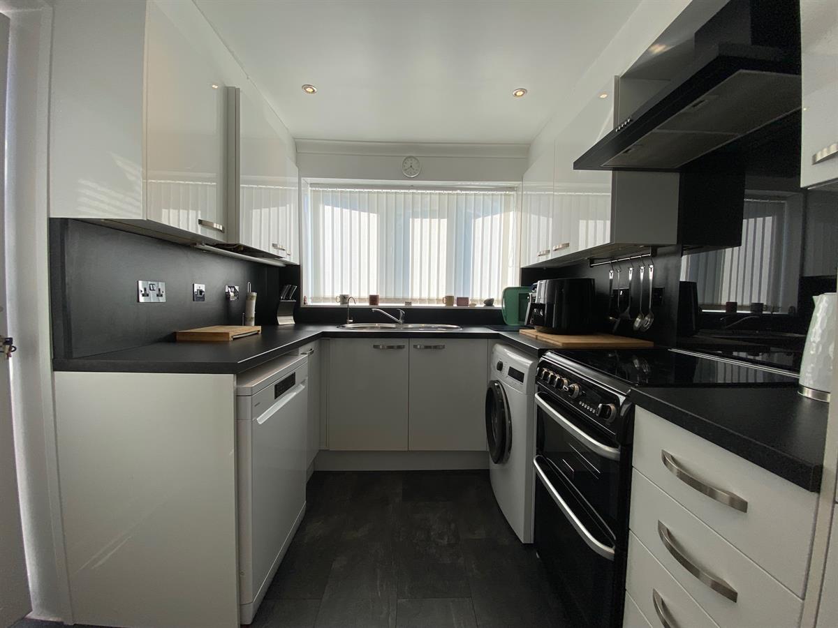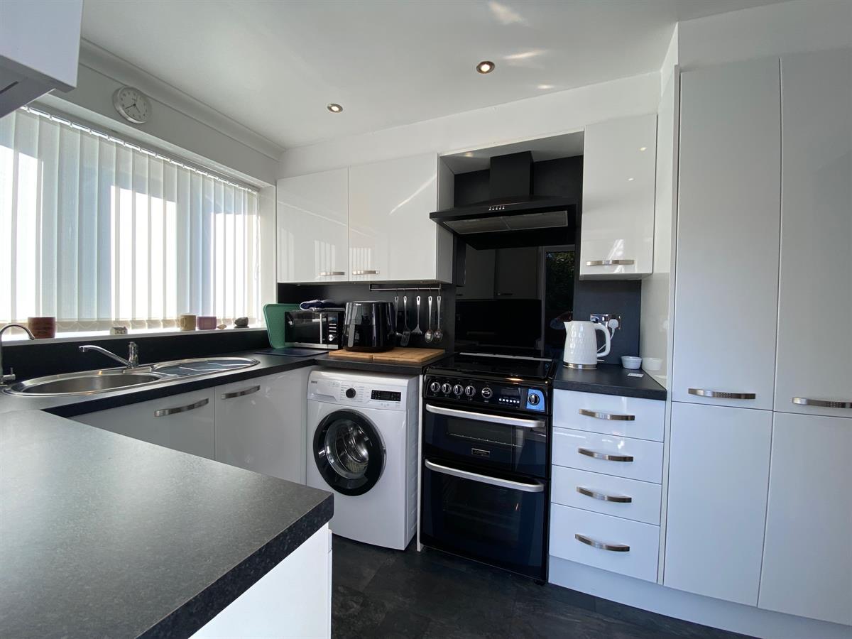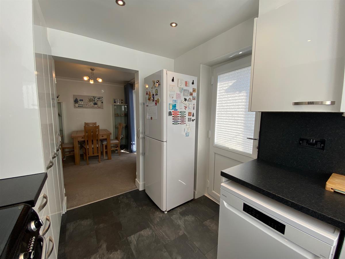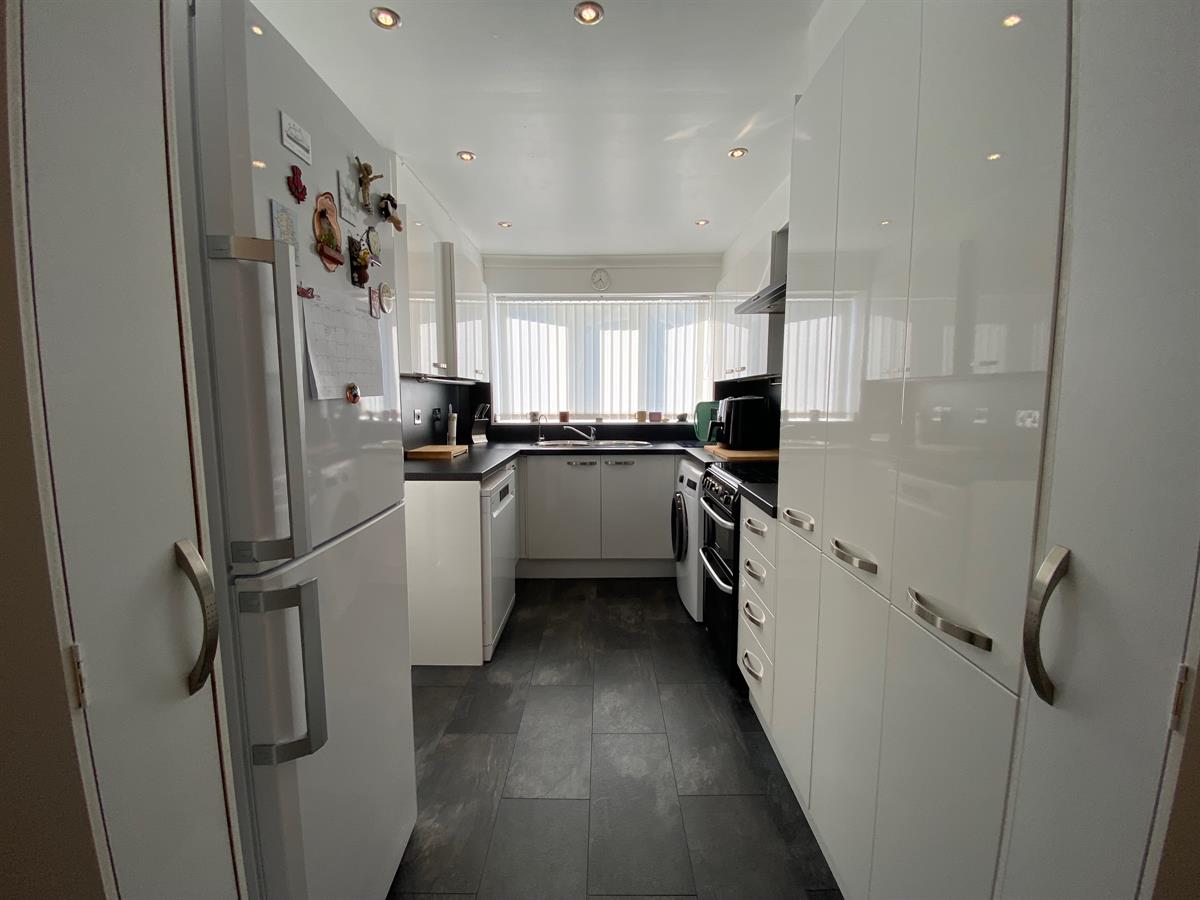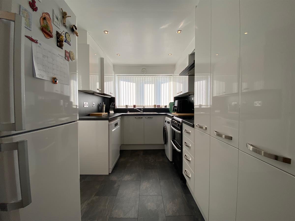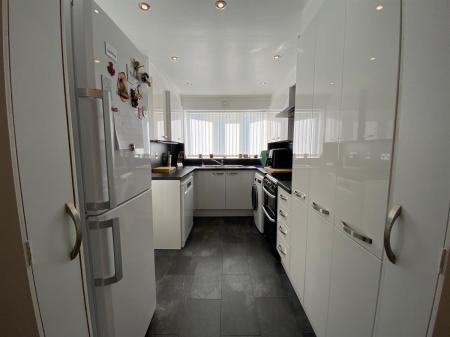 Hi Gloss white fitted kitchen with a range of wall, base and drawer units with roll top work surfaces over, incorporating a stainless steel single drainer circular sink unit with mixer tap, space for cooker with wall mounted extractor hood over, inset spot lighting, wall mounted central heating boiler concealed with the kitchen unit, space for washer, space for dishwasher, space for fridge freezer. uPvc double glazed windows to the side elevation, uPvc double glazed panelled door leading out to the rear garden.