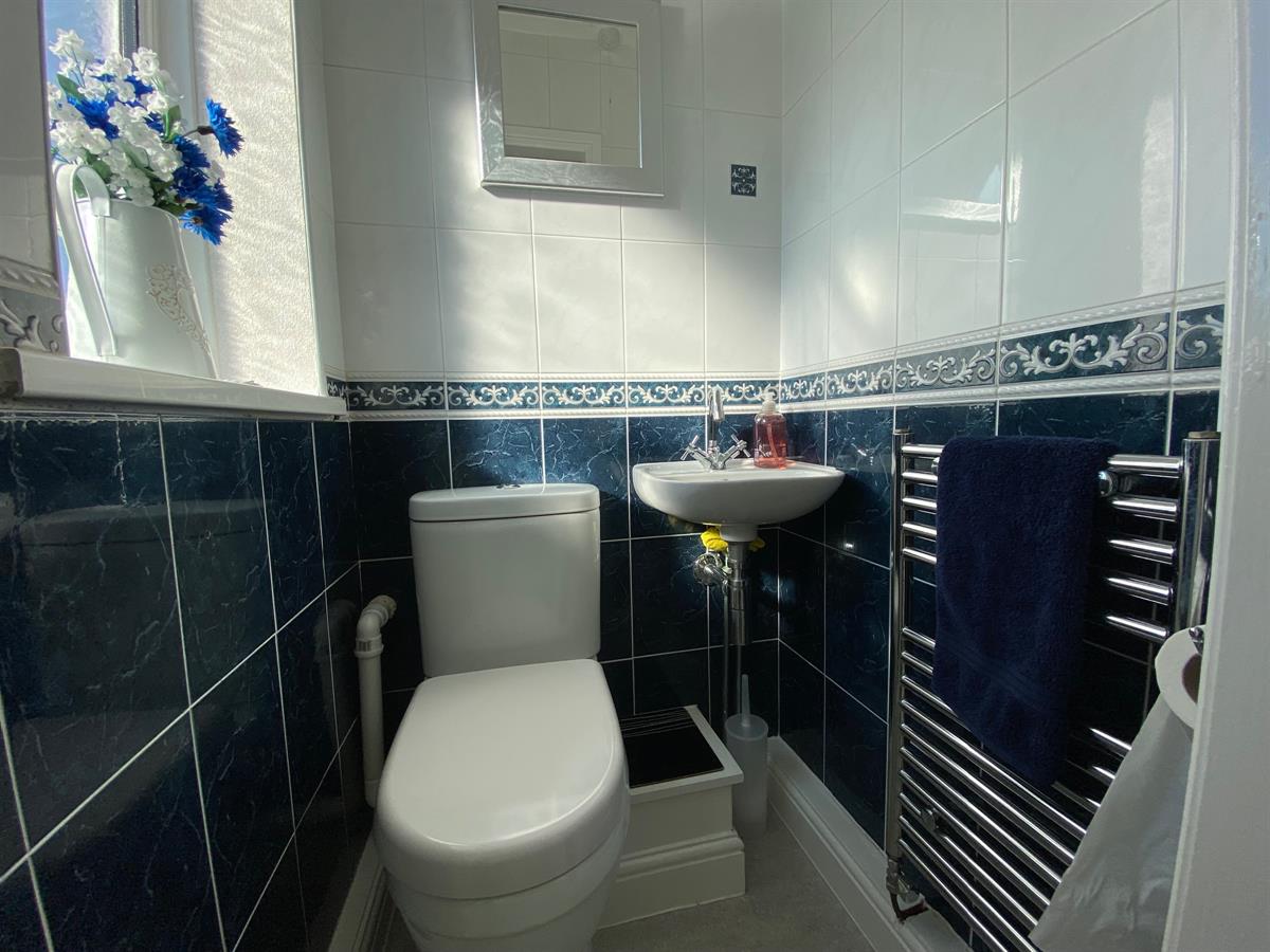 Two piece suite comprising push button low level WC, wall mounted wash hand basin, heated towel rail finished in chrome, ceiling fan, complimentary wall tiling where visible, uPvc double glazed frosted arched window to the side elevation.
