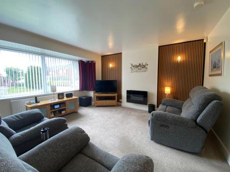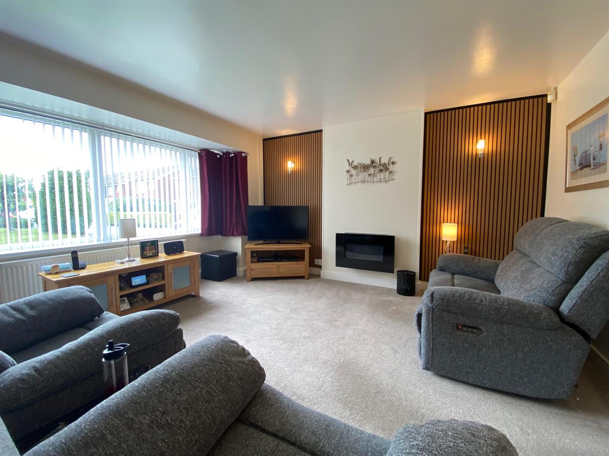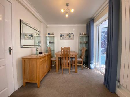 Spacious and bright living room with uPvc double glazed walk in bay window to the front elevation, double panelled radiator, wall mounted contemporary fire, uPvc double glazed frosted arched window to the side elevation, 3 wall light points, door through to the dining room, modern glazed panel staircase rising to the first floor landing and door into the under stair storage cupboard.