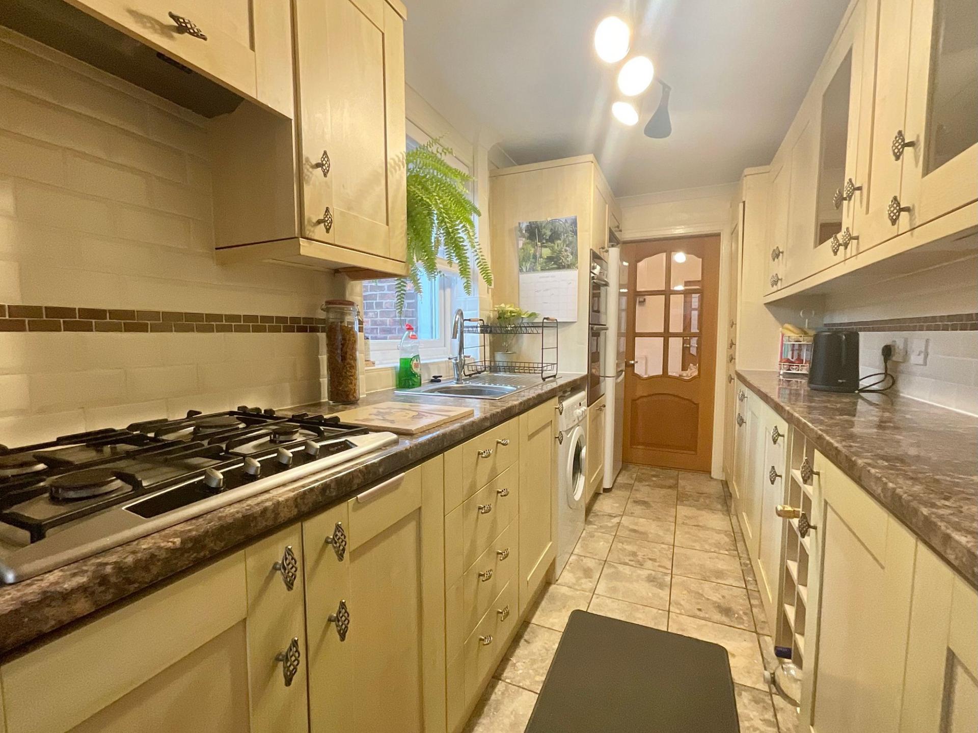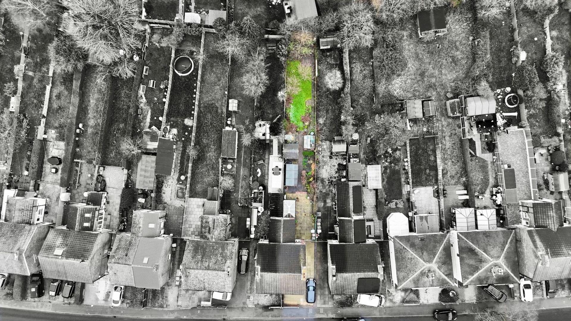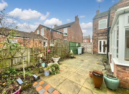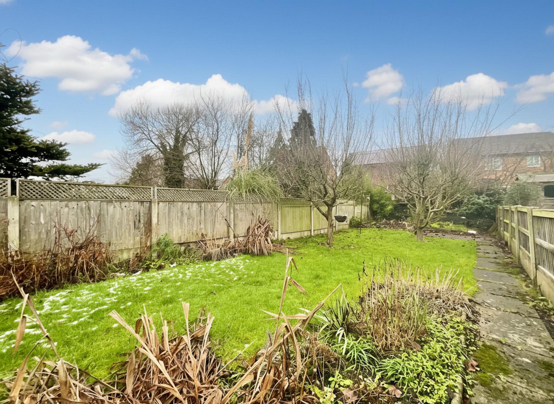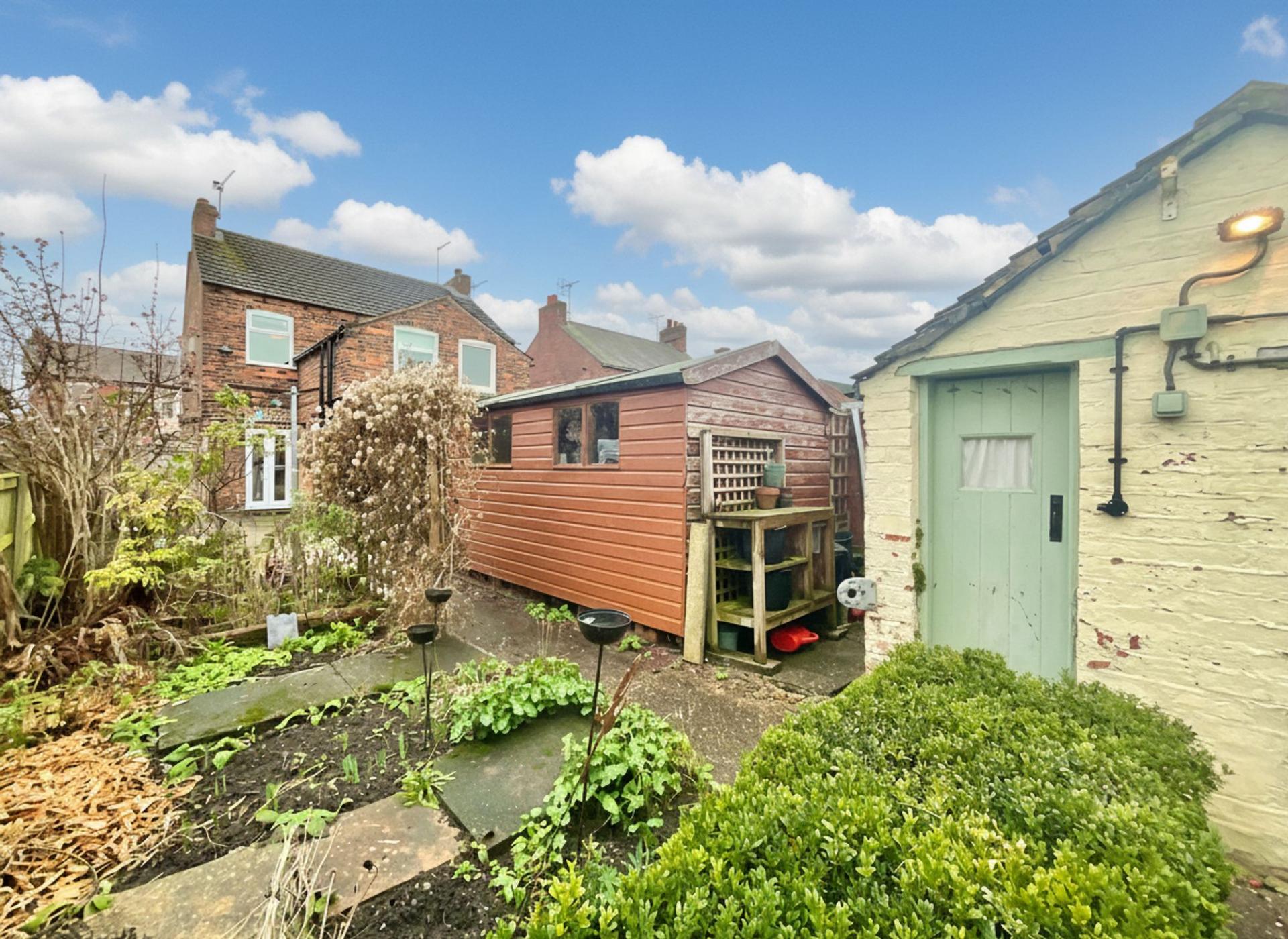- Expansive rear garden with lawn and sheds, plus driveway parking for two to three cars.