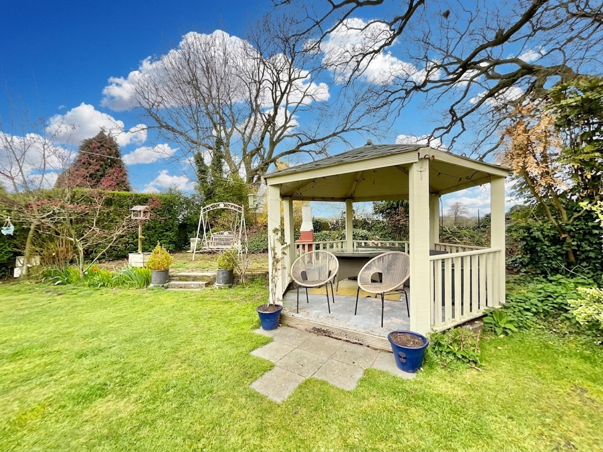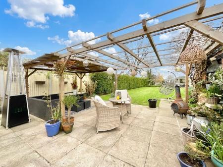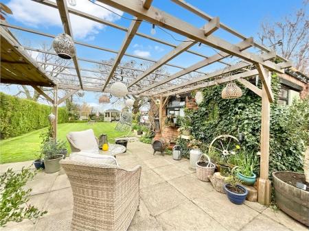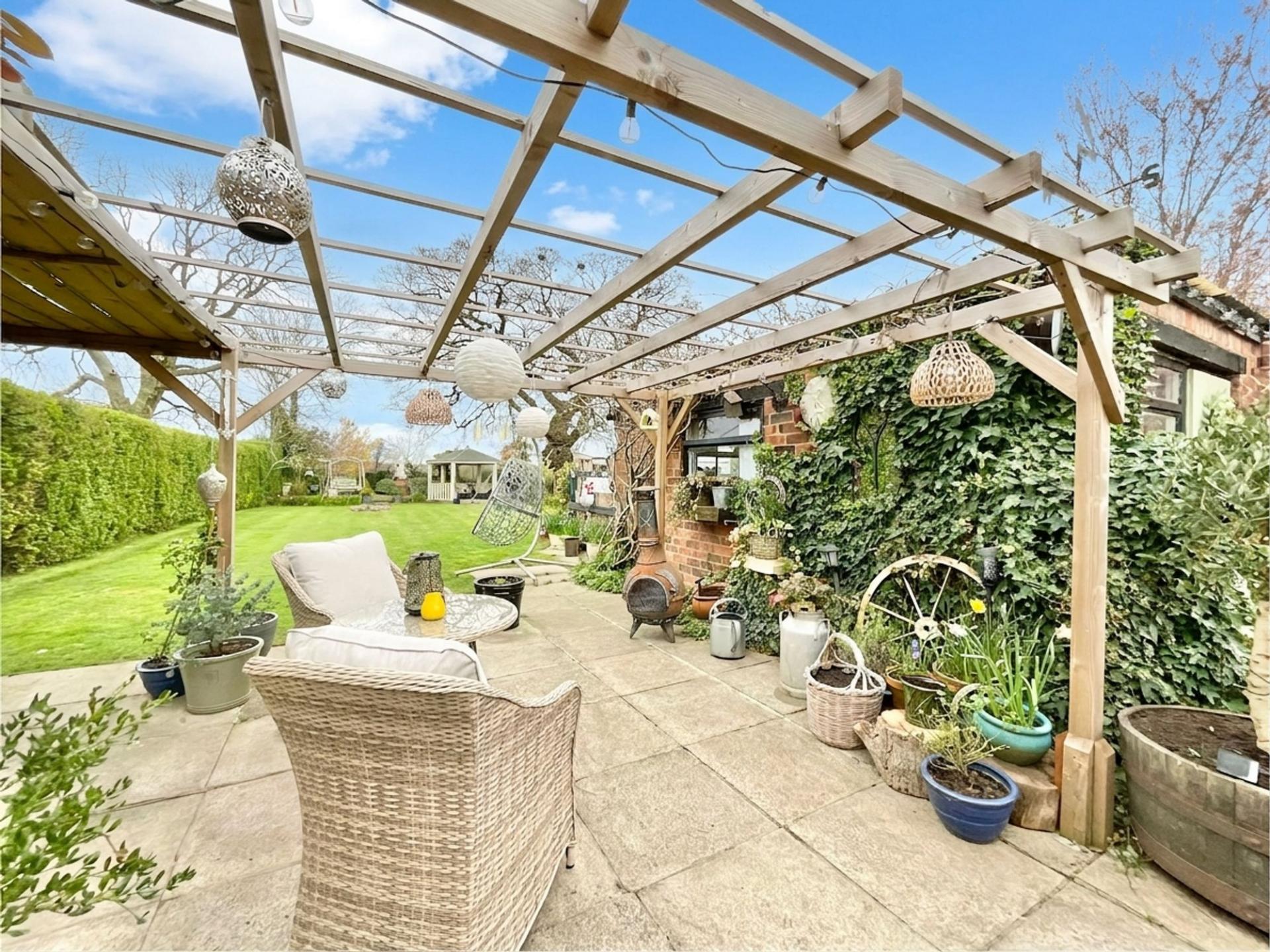 - Generous garden with patio, pergola, multiple seating areas, plus double garage and ample driveway parking