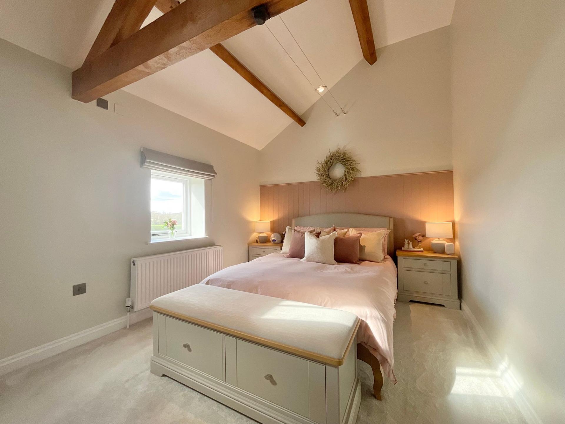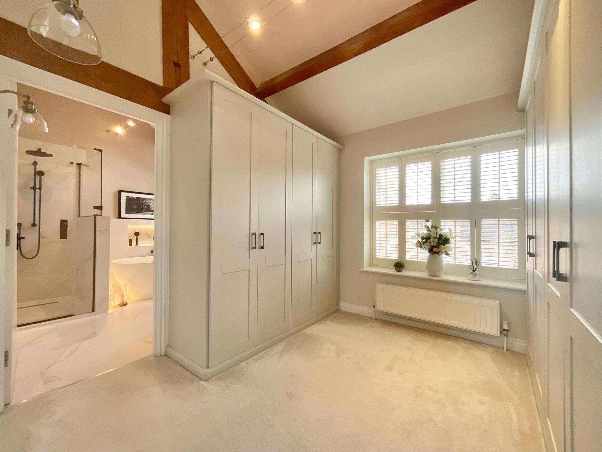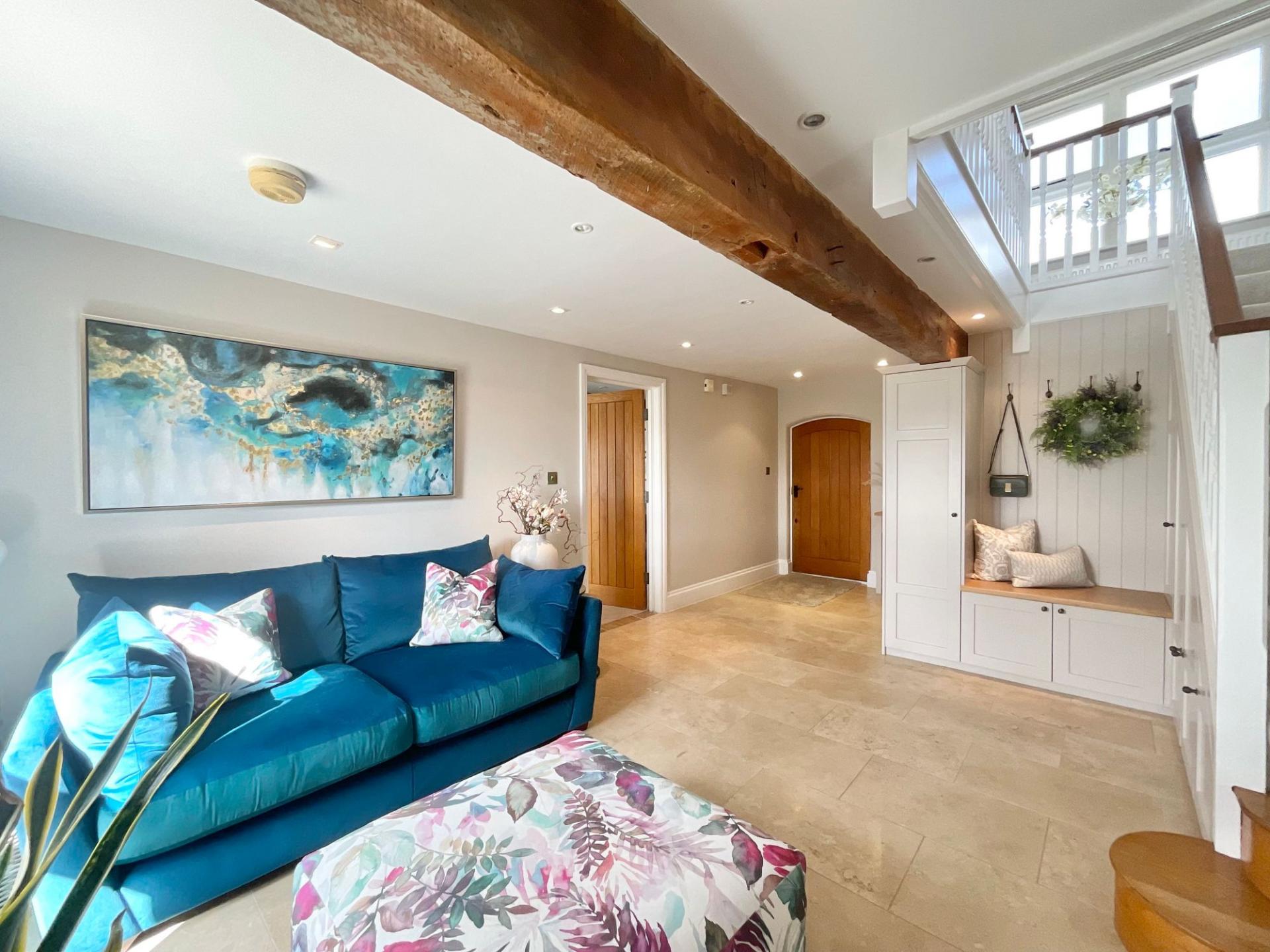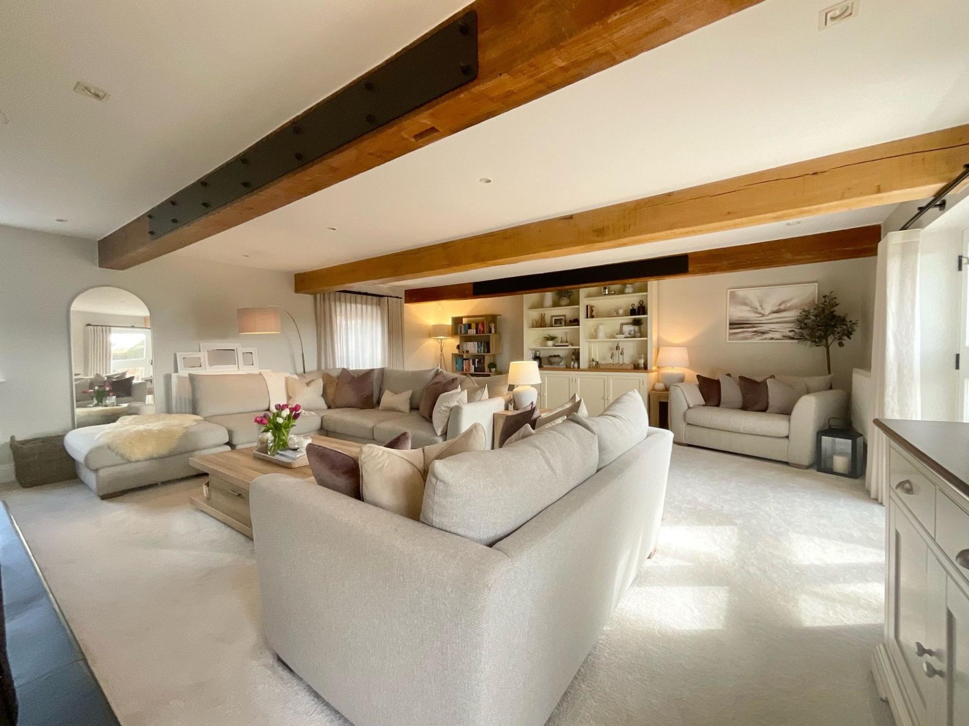 - Stylish barn conversion blending modern country design with retained character features, including exposed oak beams, throughout.