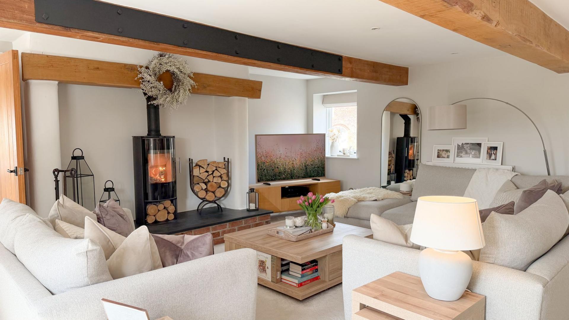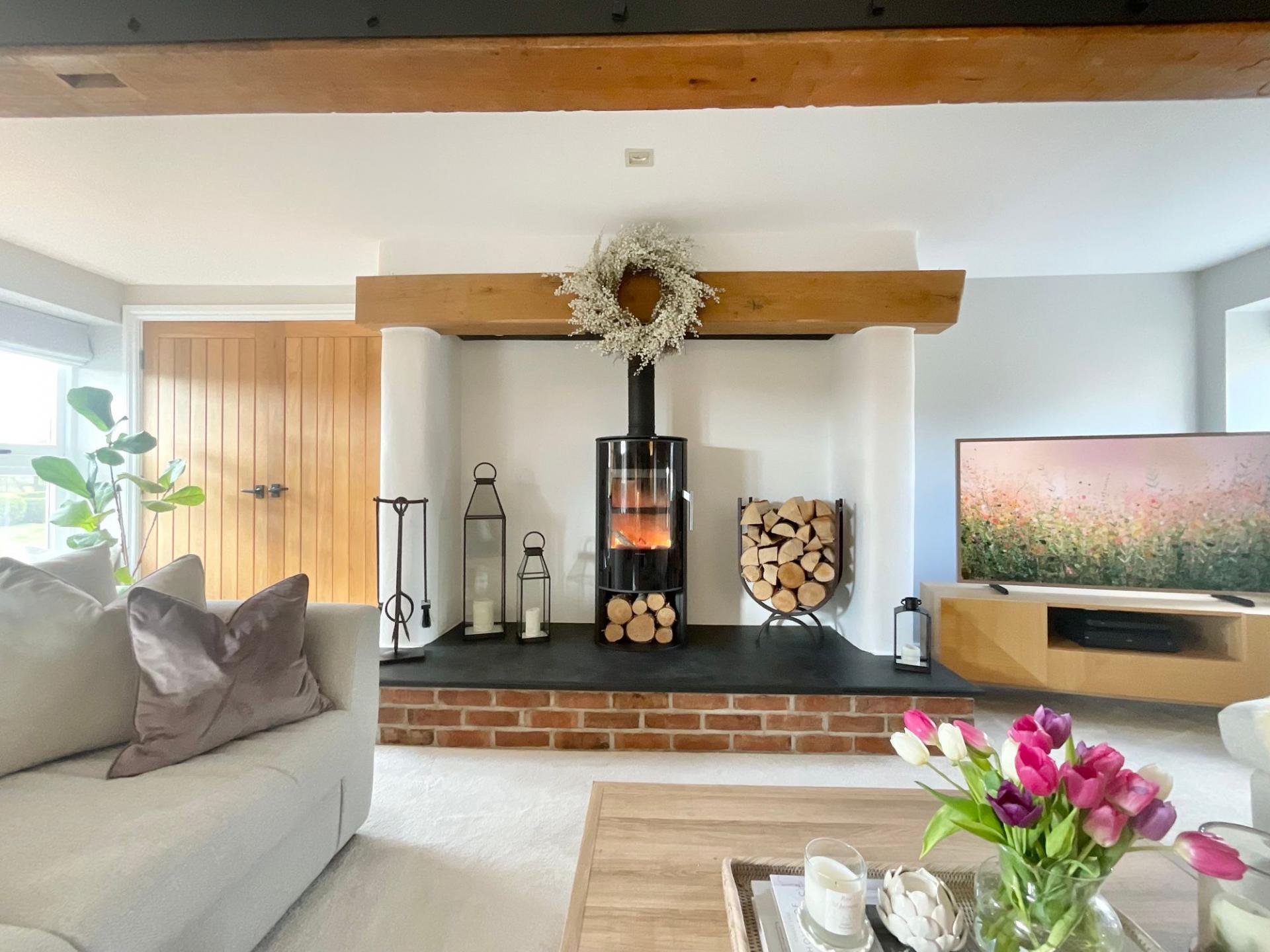 - Spacious living room with log burner and French doors opening onto a patio for seamless indoor-outdoor living.