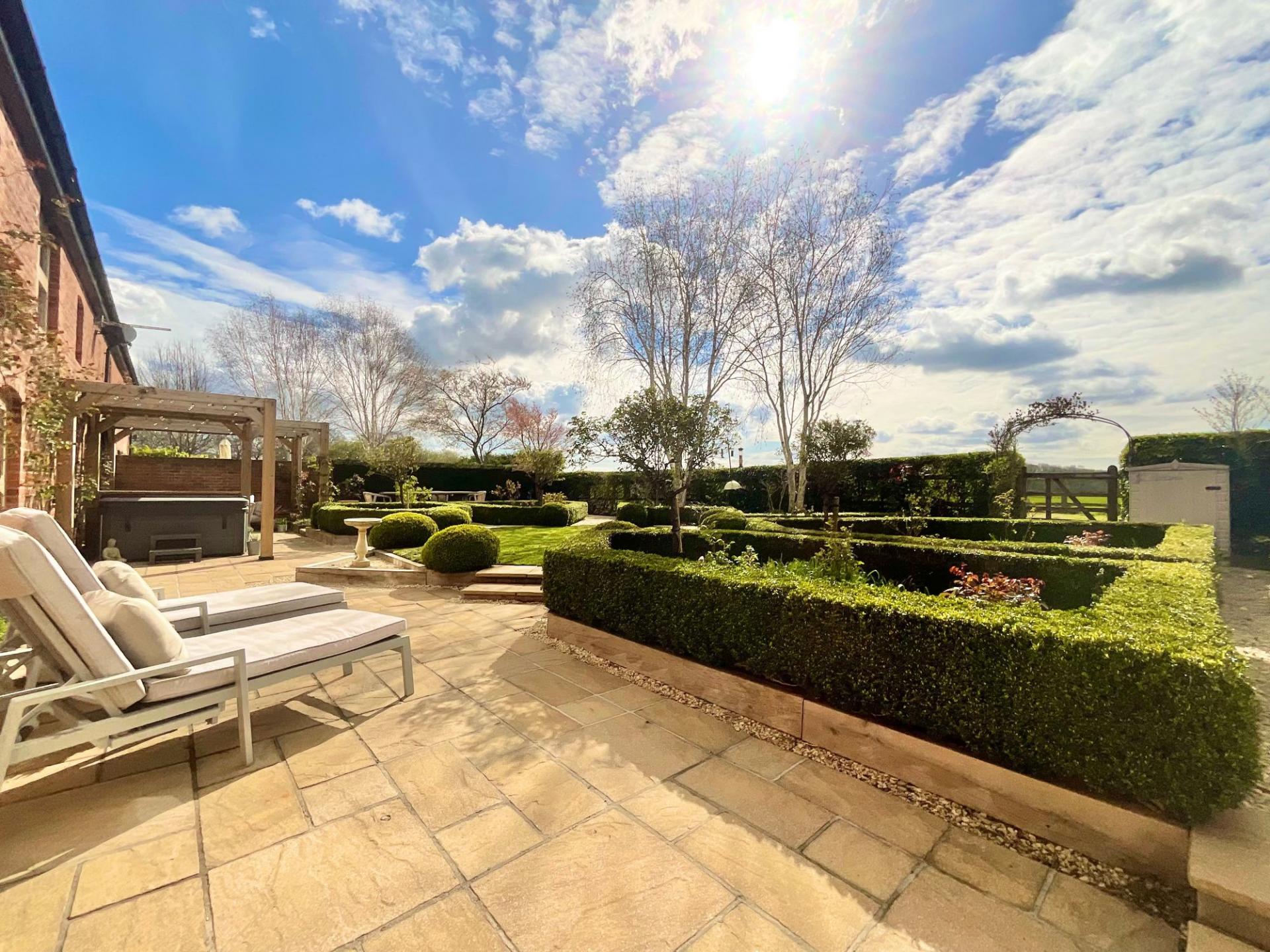 - Private landscaped cottage garden with pergola-covered seating area, raised patio and hot tub, creating a serene outdoor retreat.