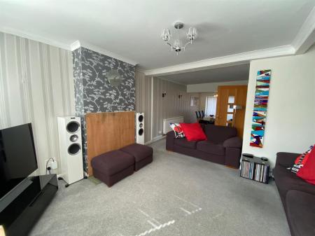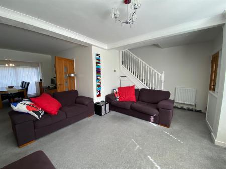 Spacious open plan living / dining room with stairs rising to first floor landing, coving to ceiling, radiators, understairs cupboard, uPvc double glazed windows to front elevation and uPvc sliding doors to the rear. A glazed oak door leads into: