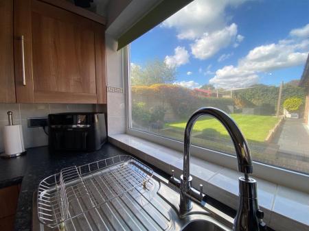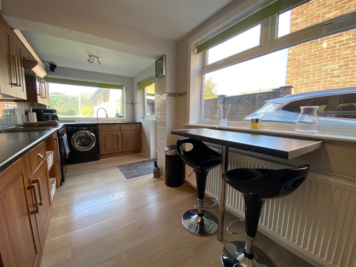 Large kitchen fitted with a range of wall, base and drawer units in a dark oak finish with work surface over incorporating a single bowl stainless steel sink and drainer with mixer tap, complimentary tiling, space for under counter fridge, space for undercounter freezer, space an plumbing for washing machine, space for electric oven with extractor over, uPvc doble glazed windows to rear and side elevations, modesty glazed uPvc door to side elevation, wall mounted central heating boiler, breakfast bar to compliment to kitchen, radiator.