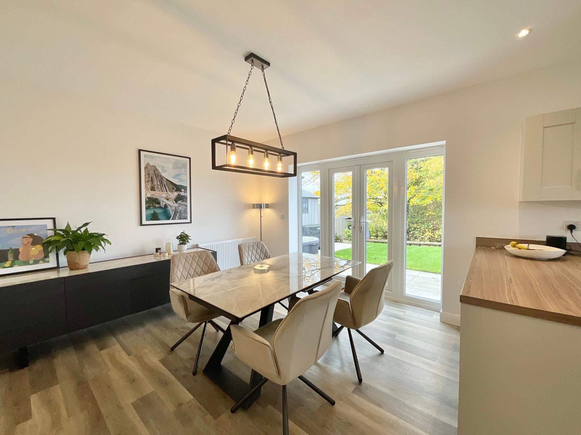 The kitchen and dining area form the true heart of the home — a stunning open-plan space designed for modern living. The kitchen is fitted with sleek, contemporary units and a range of integrated appliances, including a double oven, gas hob, fridge, freezer, and dishwasher. A breakfast bar creates the perfect spot for casual dining or a morning coffee, while there’s ample space for a large dining table to gather family and friends. French double doors open out onto the garden, blurring the lines between indoor and outdoor living and creating an ideal setting for summer entertaining.