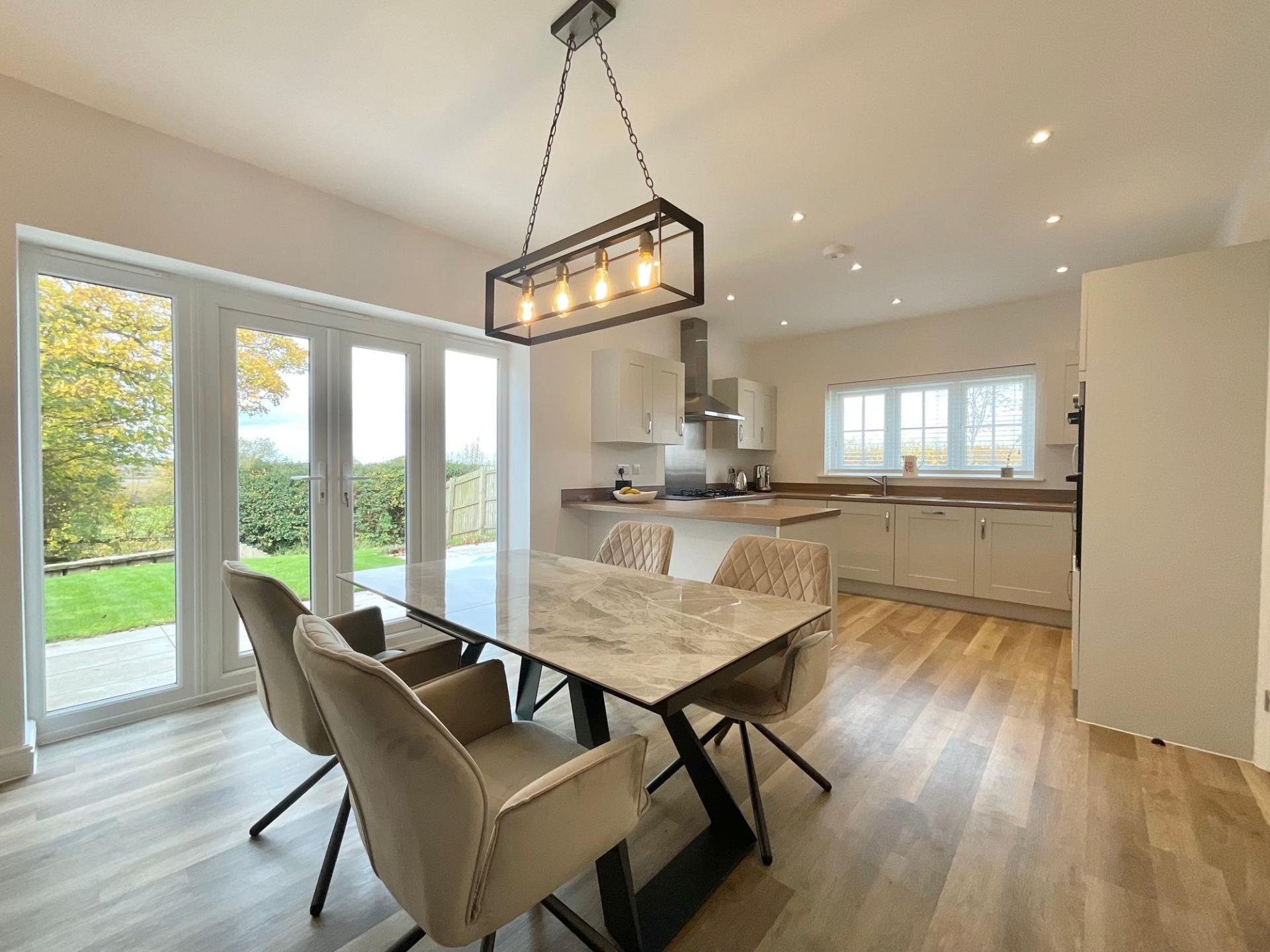 • Contemporary open-plan kitchen and dining area with integrated appliances, breakfast bar, and French doors opening to the garden.