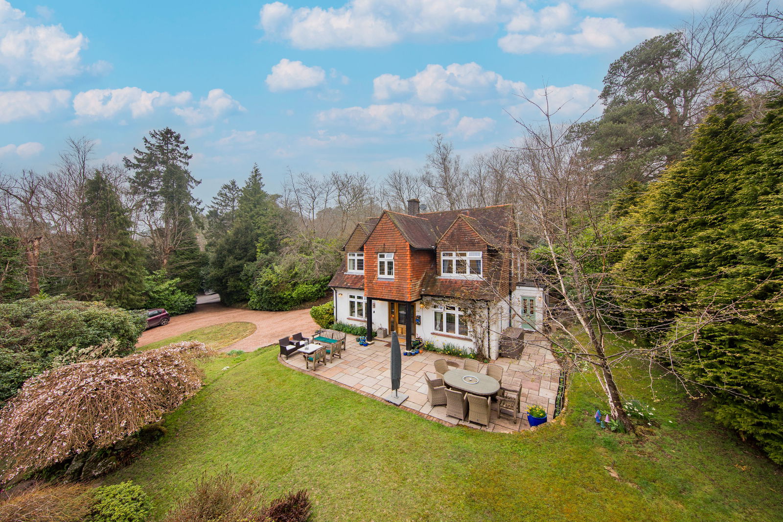 This beautifully presented detached family house, set within the prestigious "Warren Area" of Crowborough, offers a unique blend of privacy and the feel of space. Nestled on a large plot at the end of a private drive, this much-loved property boasts four spacious double bedrooms, including an especially impressive master bedroom with vaulted ceilings, a modern en suite, and large floor-to-ceiling windows that offer stunning views of the front garden. This bedroom also provides direct access to a generous roof terrace. For those seeking multi-generational living, the home includes a convenient downstairs bedroom with an en suite located next to an annexe, ideal for visiting relatives or extended family stays. Multiple reception rooms offer flexibility for relaxation and entertaining, while the heart of the home is the spacious kitchen/breakfast room, complete with an adjacent utility room. The extensive, tranquil gardens provide an idyllic retreat, featuring a lovely patio that enhances the outdoor space. For those considering working from home, the garden offers ample space to accommodate a home office, subject to the usual consents. In addition to the stunning interiors and outdoor spaces, the property features a carport, garage, and ample parking. A particular highlight of this home is its direct access to the beautiful Ashdown Forest, making it ideal for nature lovers, walking enthusiasts, and those who enjoy the great outdoors. This is a perfect blend of spacious and versatile accommodation, comfort, and nature in one of Crowborough's most desirable areas.