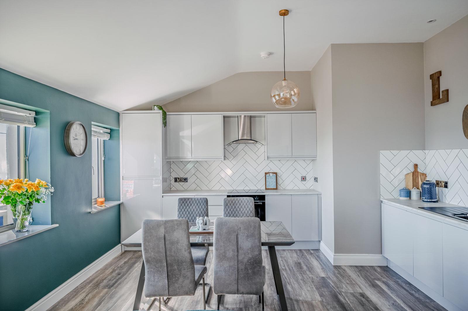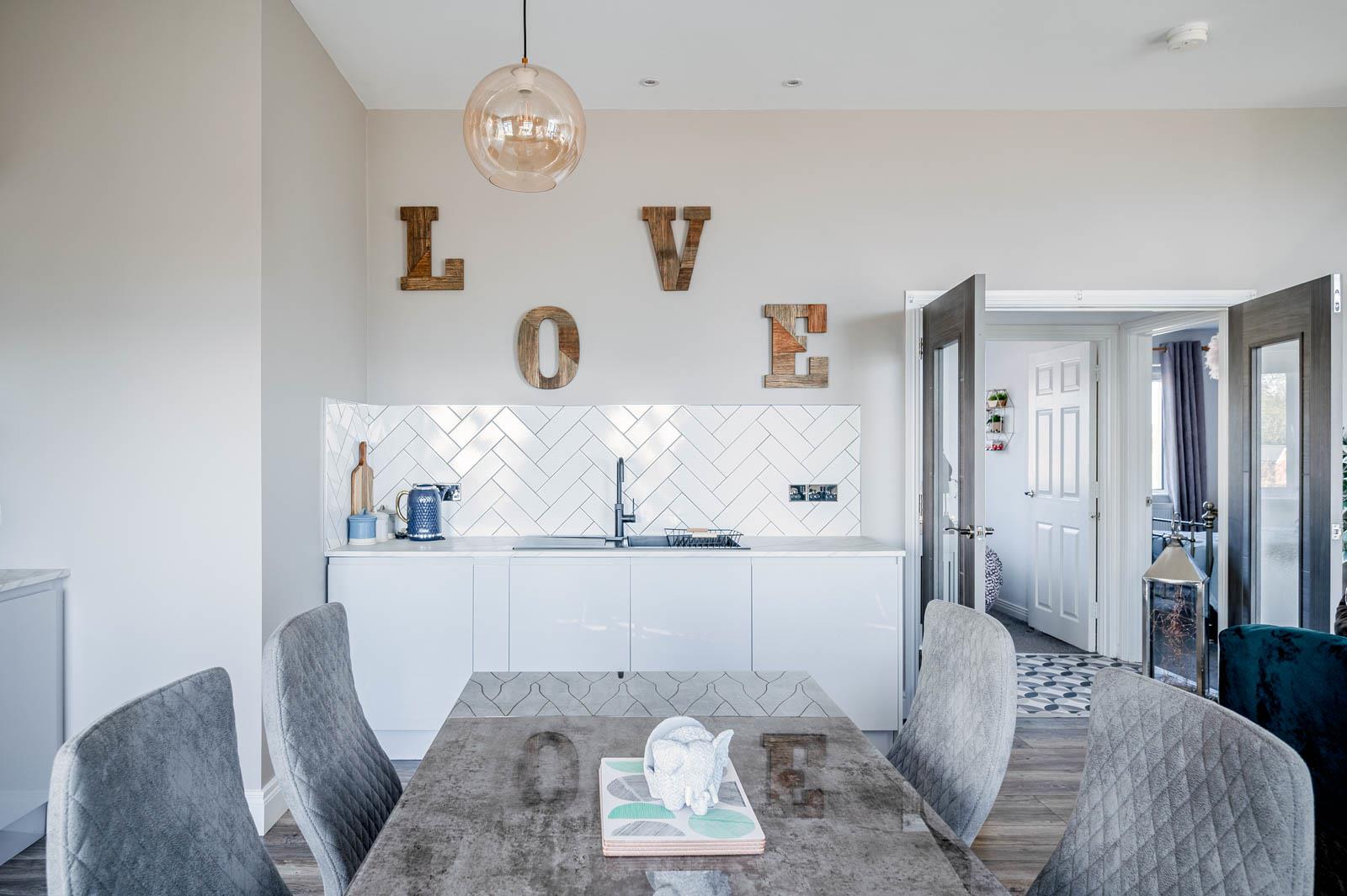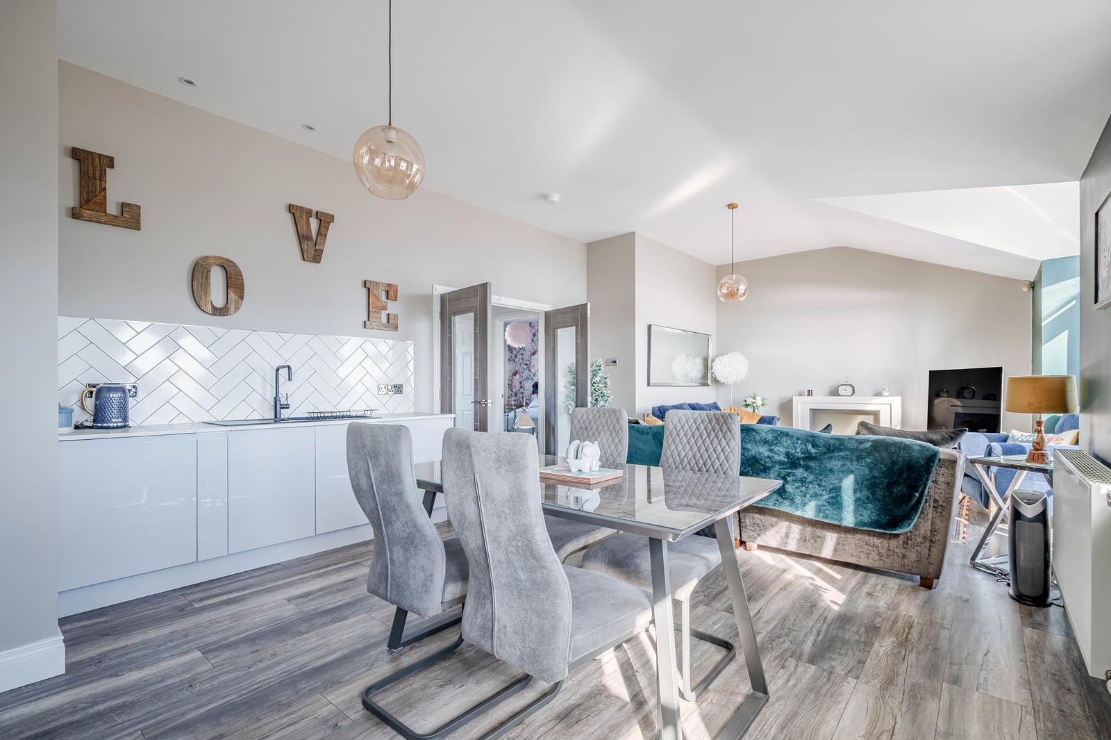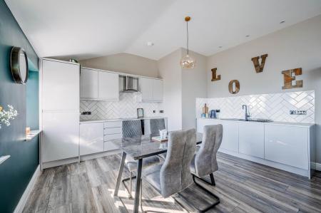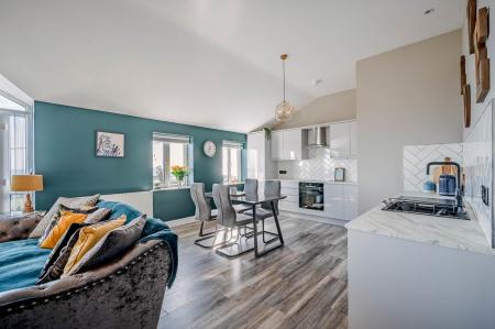 Open Plan Kitchen And Living Room - (8.47m x 4.36m) - Modern range of high and low level units, laminate work surface, single stainless steel drainer with mixer tap, built in electric oven, integrated extractor fan and fridge/freezer.