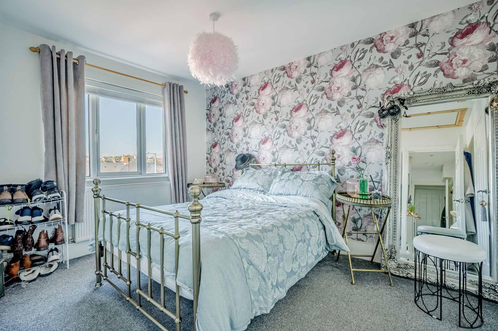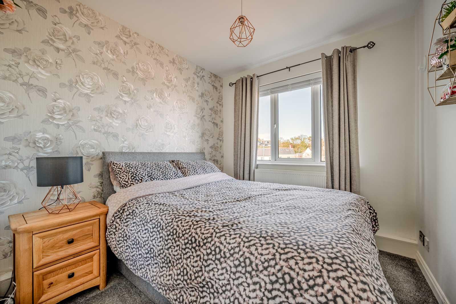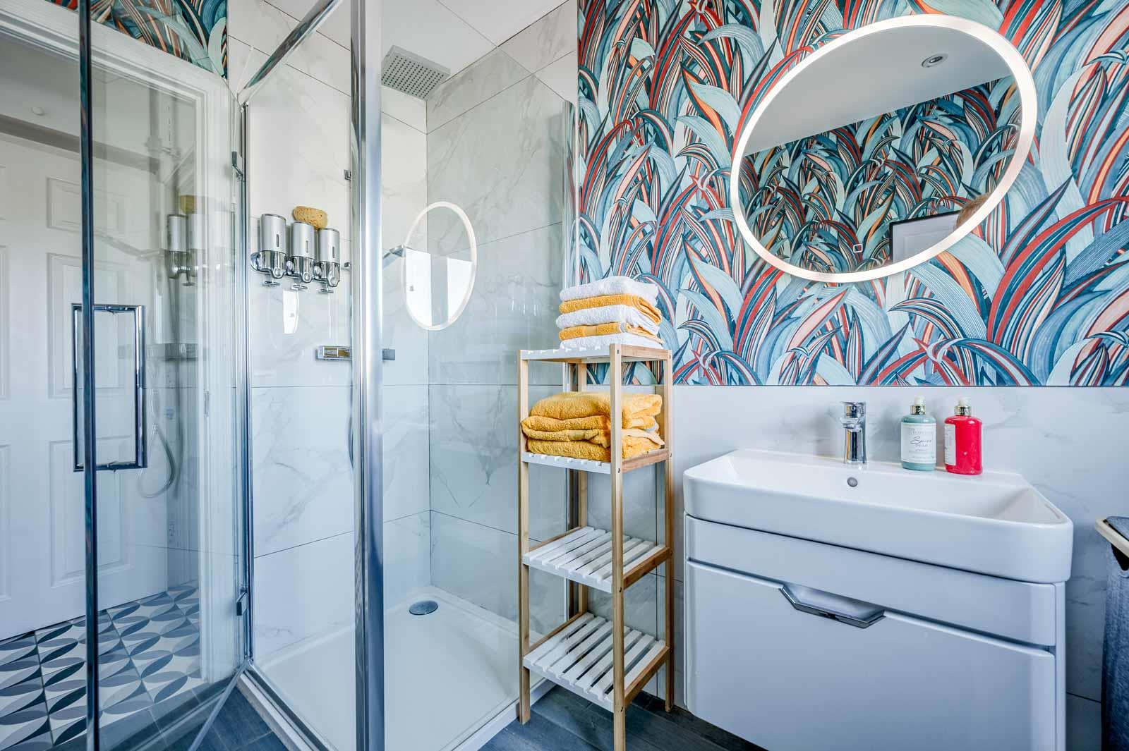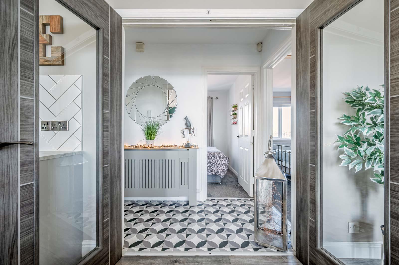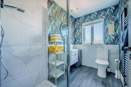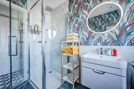 This beautifully presented apartment features two well-proportioned bedrooms, including a generous principal bedroom with built-in wardrobes and access to roof storage. The second bedroom is equally inviting and ideal for guests or home working. The bathroom is finished to a high standard with a modern white suite, including a large walk-in shower, and a stylish vanity unit. Contrasting floor and wall tiling completes the space.