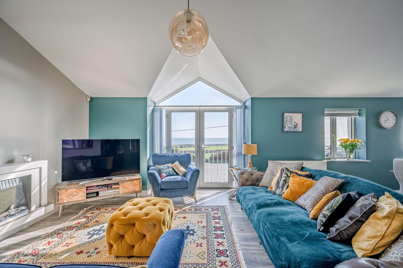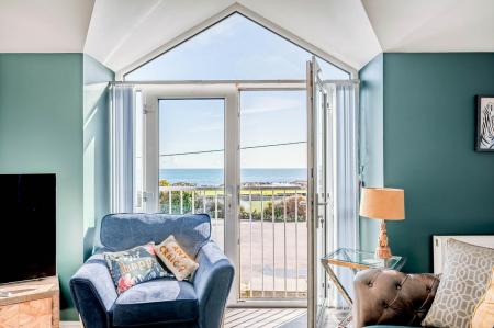 Number 12 has been thoughtfully upgraded, most notably with a recently renovated open plan kitchen and sitting room, now a bright and contemporary space that's perfect for both everyday living and entertaining. Floor-to-ceiling French doors, deep-set windows, and a striking vaulted ceiling flood the space with natural light, while the layout makes the most of the breath-taking sea views. The kitchen is modern and cleverly designed, with sleek cabinetry, ample space for a table, and excellent storage.