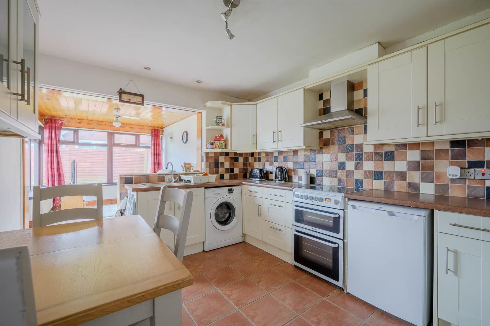 Kitchen/Dining - 7.98m x 3.00m (26'2 x 9'10) - Range of high and low level units, laminate work surfaces, single bowl single drainer stainless steel sink unit with mixer tap, recess for fridge, space for freezer, space for cooker, tiled splashback, extractor fan above, plumbed for washing machine, concealed strip lighting, fully tiled floor, part tiled walls, dining and family area with tongue and groove ceiling, uPVC double glazed door to outside.