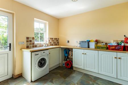 Utility Room: - (3.66m x 3.18m) - Storage cupboards, laminate work surfaces, single bowl single drainer stainless steel sink unit with mixer tap, plumbed for washing machine, fully tiled floor, part tiled walls, uPVC double glazed door to outside.