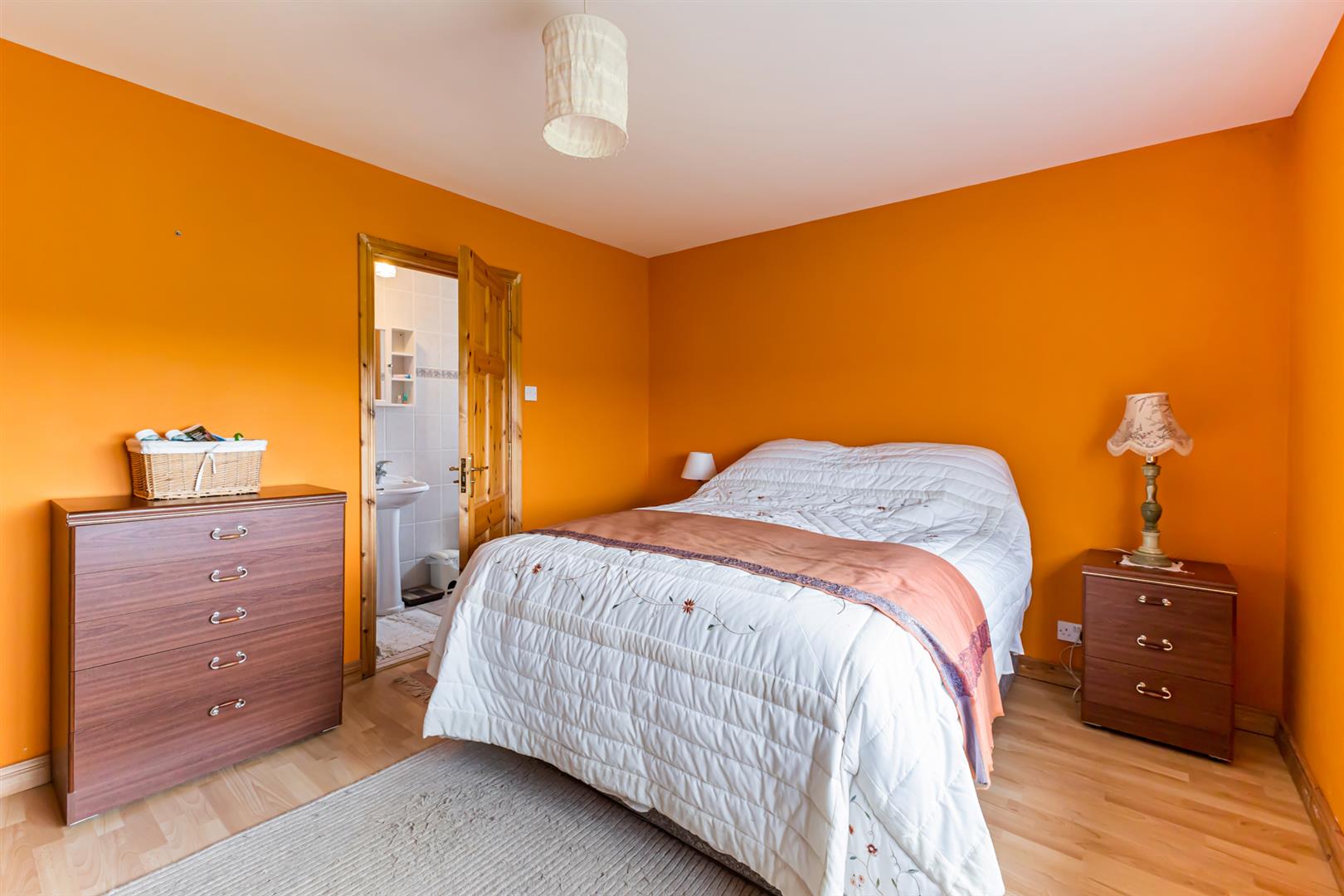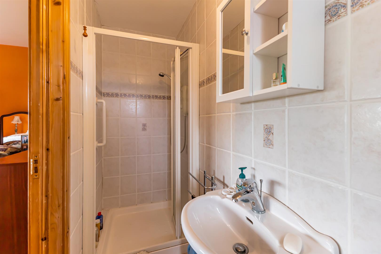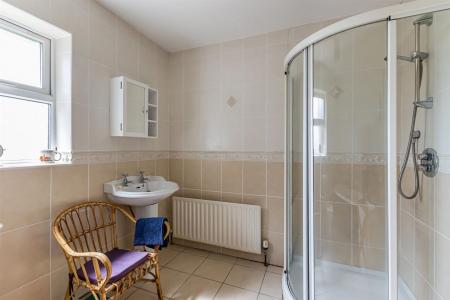 Ensuite Shower Room: - () - Three piece comprising built-in fully tiled shower cubicle, pedestal wash hand basin with mixer tap, low flush WC, fully tiled floor, fully tiled walls, extractor fan.