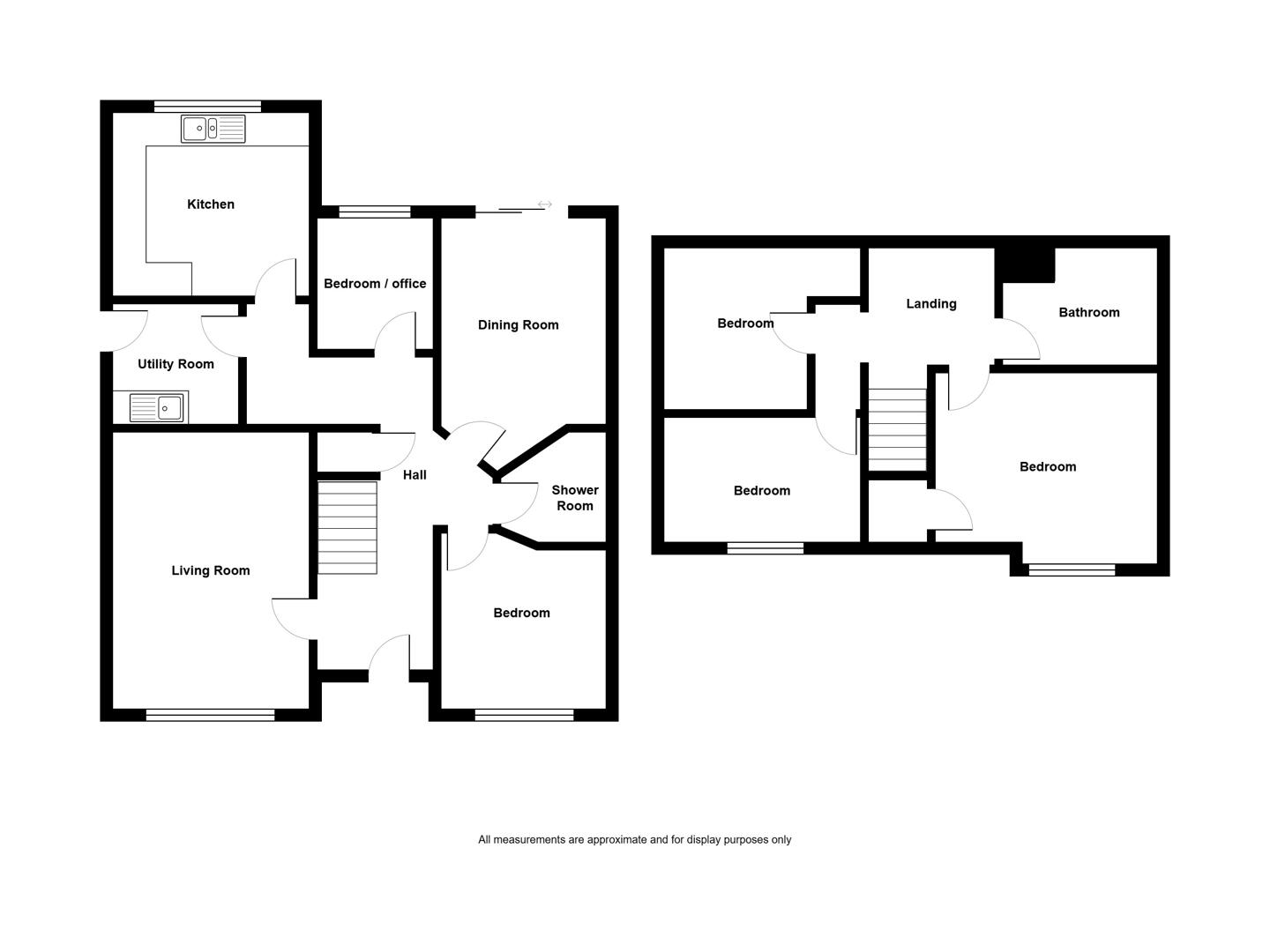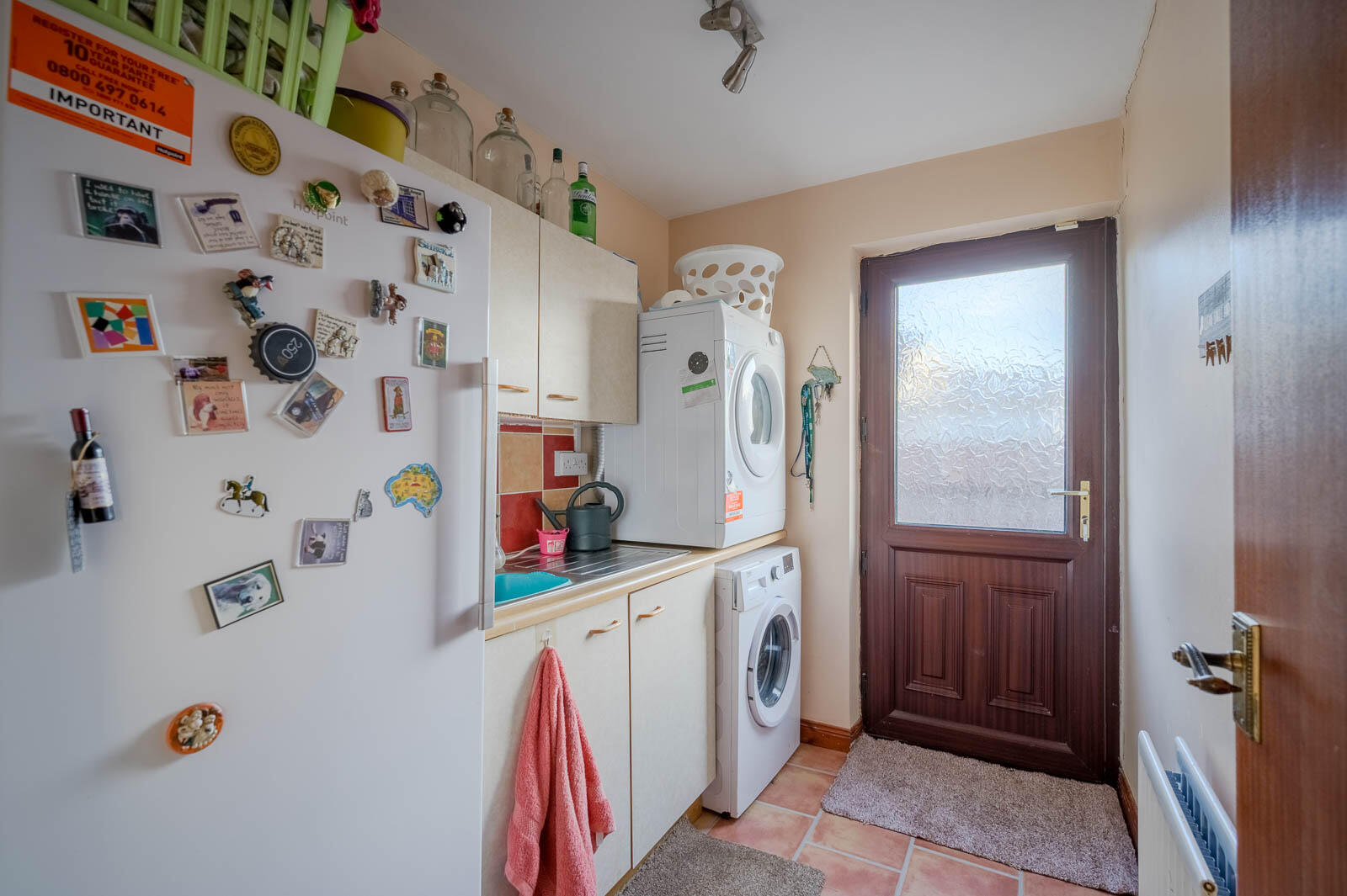 Utility Room - Storage cupboards, laminate work surface, single bowl single drainer stainless steel sink unit, laminate tile effect floor, uPVC double glazed door to outside.