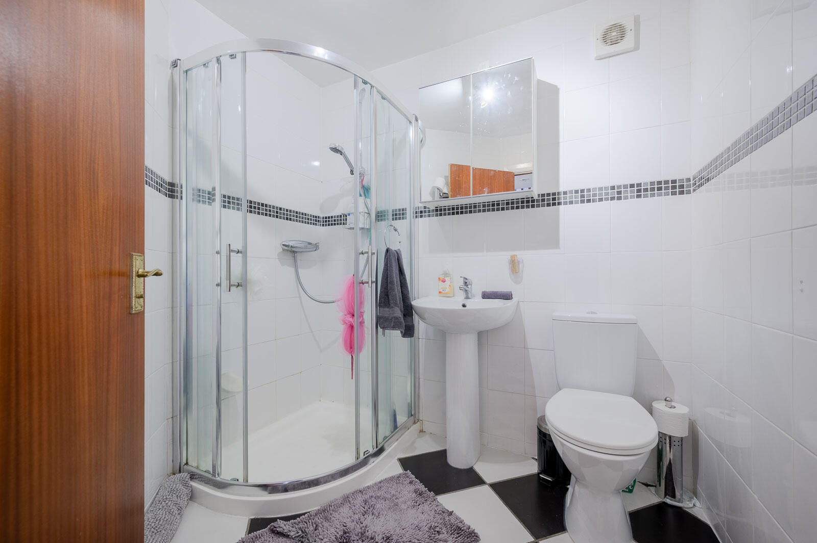 Shower Room - Three piece suite comprising built-in fully tiled shower cubicle, pedestal wash hand basin with mixer tap, low flush WC, fully tiled walls, fully tiled floor, chrome heated towel rail, extractor fan.