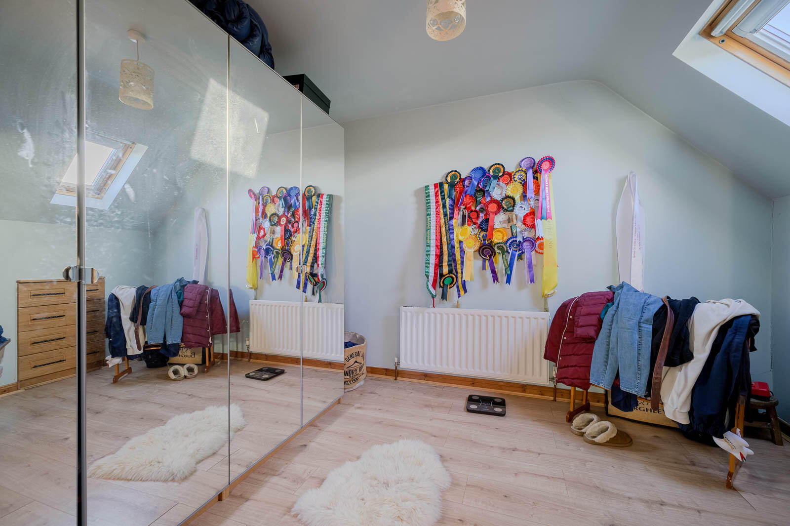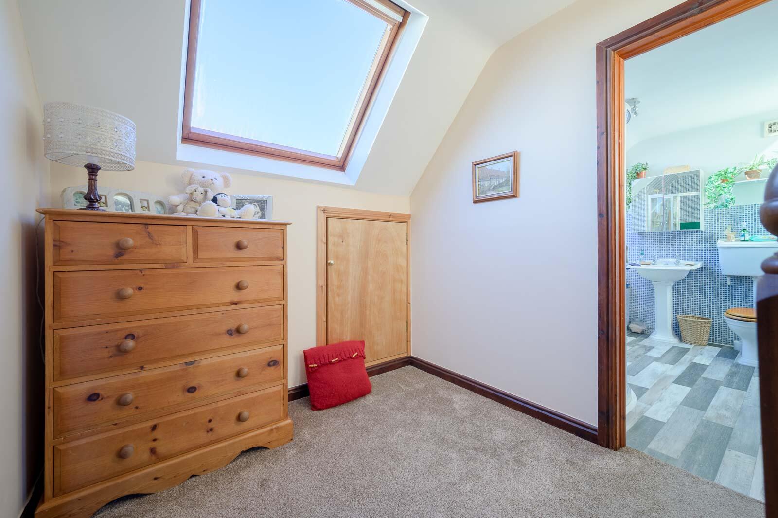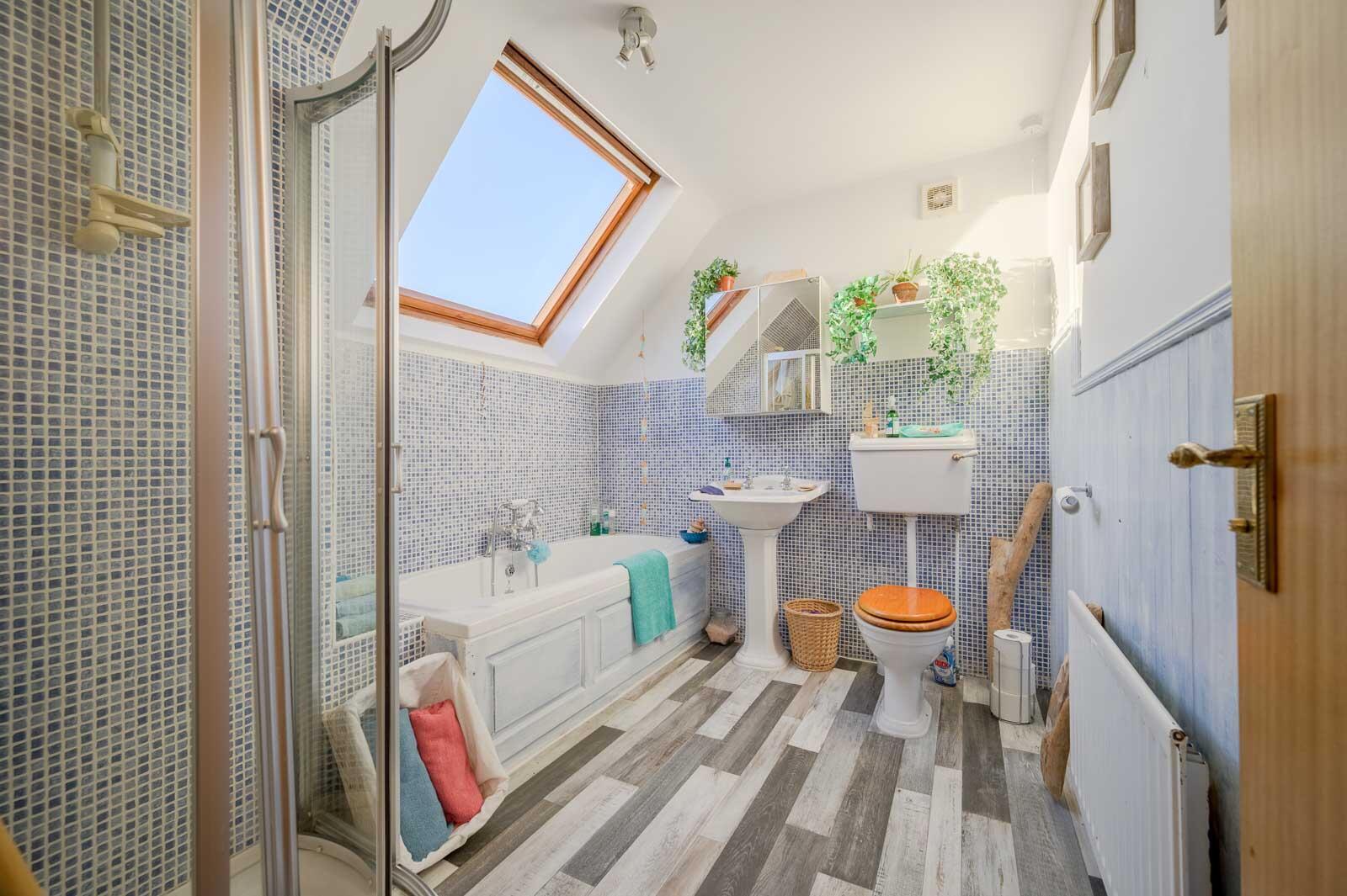Bathroom - Four piece suite comprising panelled bath with mixer tap, telephone hand shower, separate built-in fully tiled shower cubicle with Triton electric shower, pedestal wash hand basin, low flush WC, part tiled walls, part tongue and groove walls, extractor fan, Velux window.