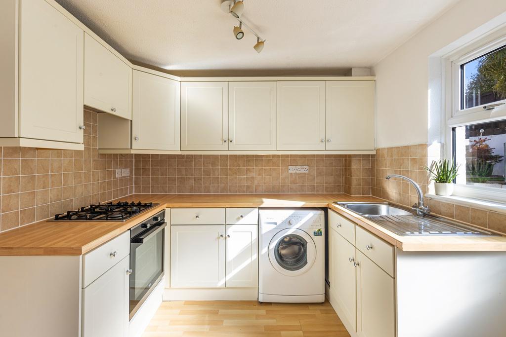 The property offers a welcoming entrance porch which opens into a light and spacious sitting room, featuring a fireplace surround with electric stove and a useful understairs cupboard. To the rear, the kitchen and dining room is well fitted with a good range of wall and base units, a built-in oven and hob, and a door leading directly to the garden.