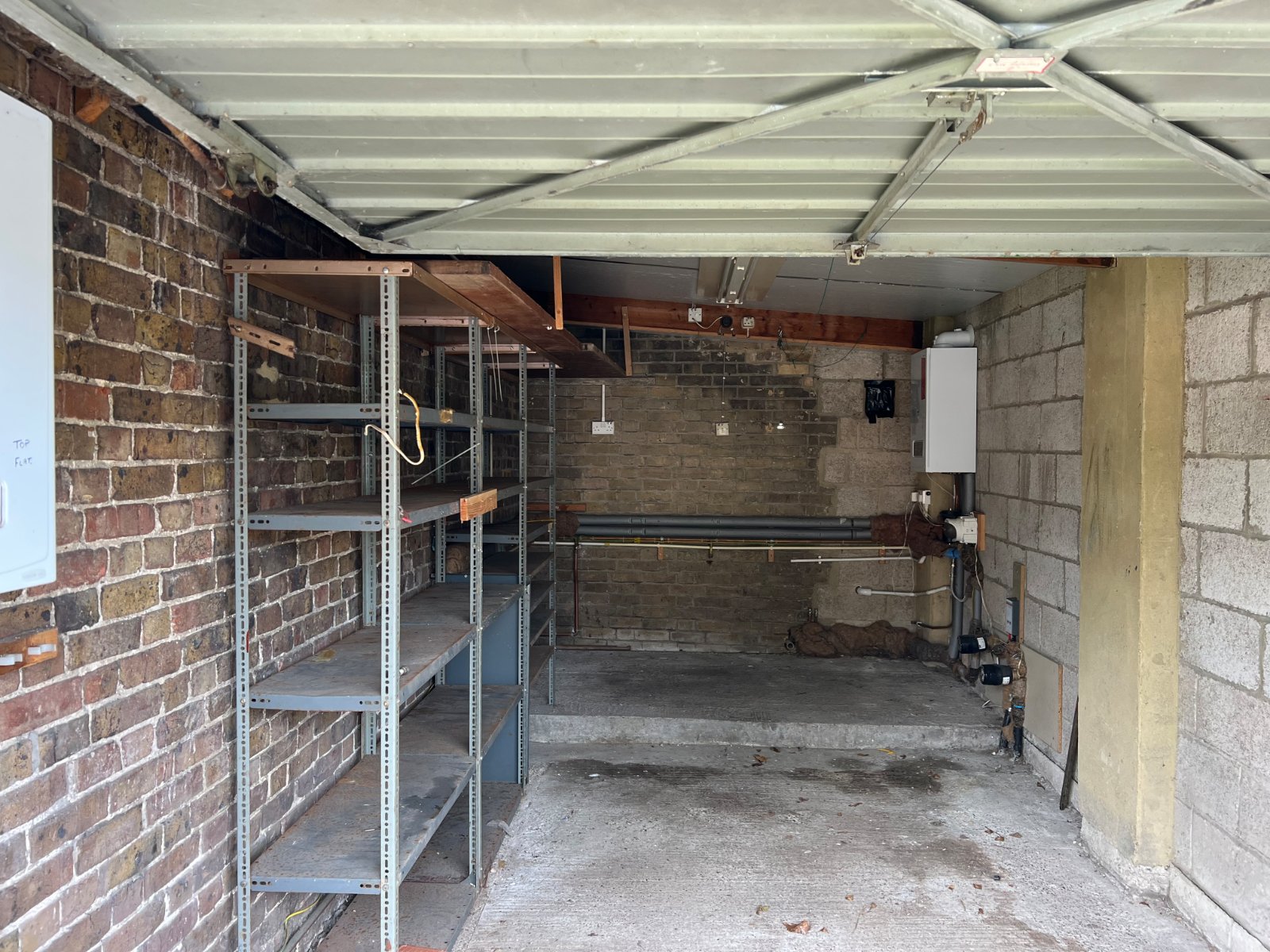 lawned front garden. To one side is a single garage with an up and over door, in which are housed two gas boilers which service the two flats.