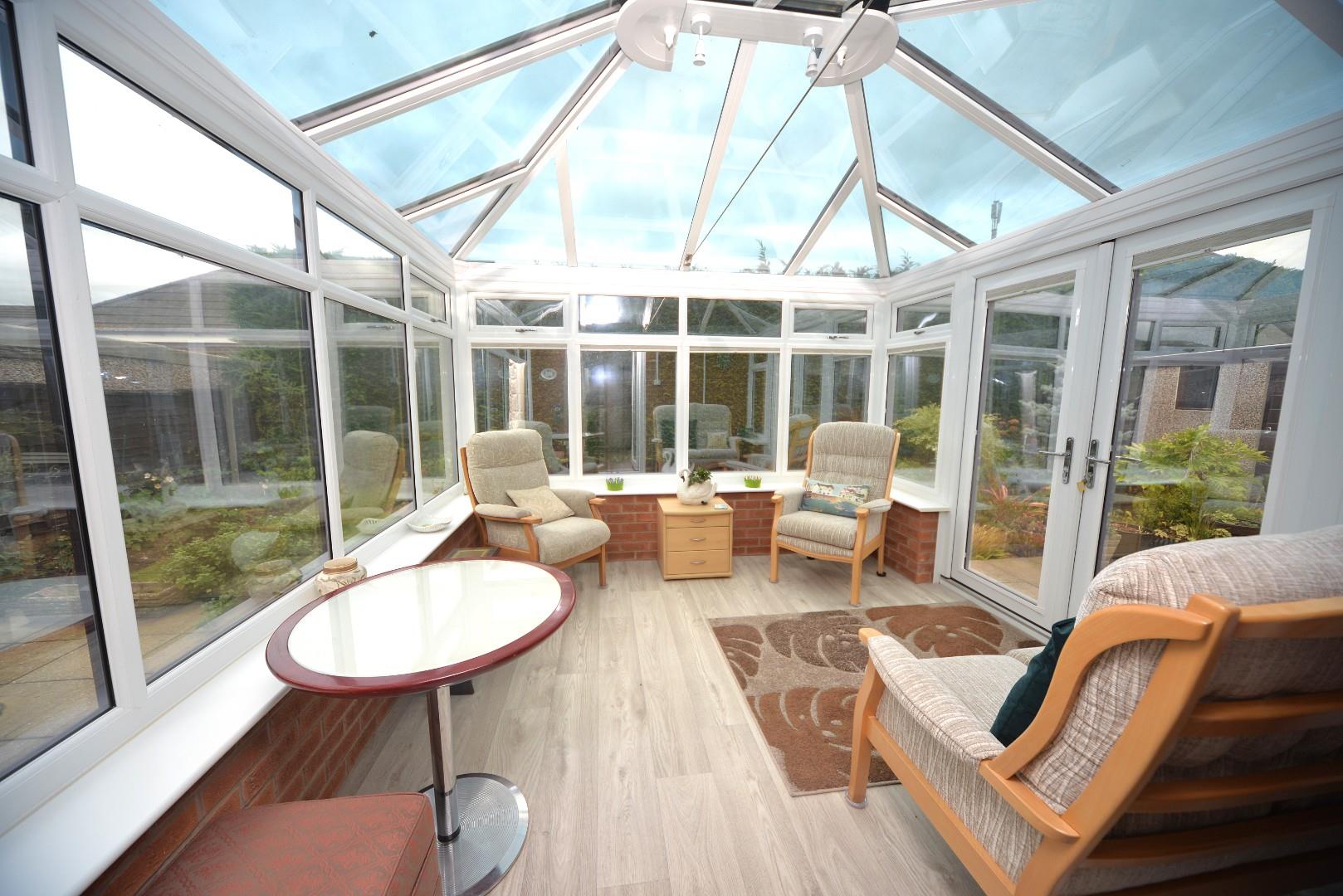 3.31m x 3.24m (10'10" x 10'7") - This attractive space has a glass roof, French doors that open out onto the patio, wood effect flooring, ceiling light point and power points.