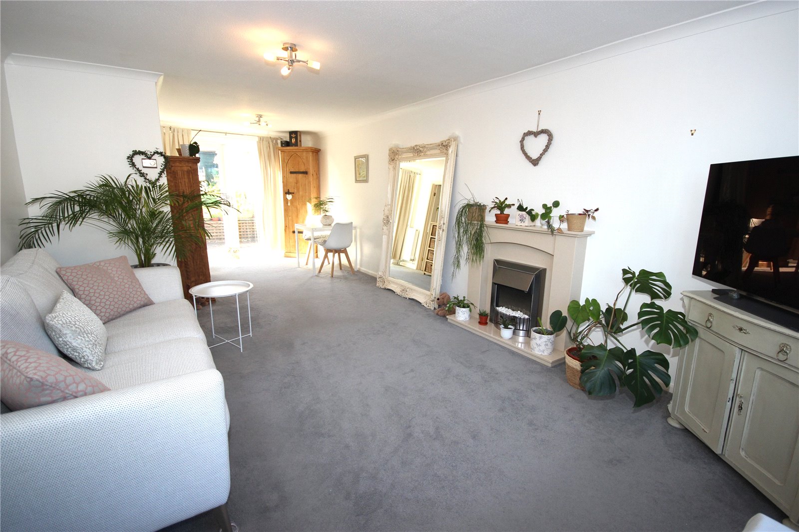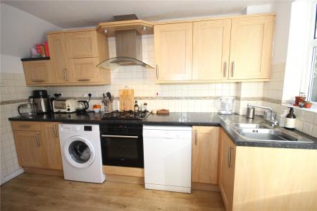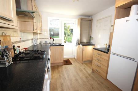 The property is entered via a canopy porch to the front of the property with front door opening into the entrance hall with stairs rising to the first floor. The door to the right opens to the bright and airy, open plan Living/Dining Room which is a through room with bow window to the front and French doors to the rear overlooking the garden. This good sized room has ample space for sofa and table and chairs and has a feature, stone effect fireplace with electric fire inset. A door then leads through to the kitchen which has a matching range of base and wall units with laminate worktops, built-in oven, gas hob with extractor over. In addition, there are tiled splash backs, a sink, cupboard housing the gas central heating boiler, space for an upright fridge/freezer and plumbing and space for a washing machine and dishwasher. A window to the rear and a door leading out to the rear garden both give views over the attractive garden beyond and wood effect flooring flows through the kitchen and back into the entrance hall.