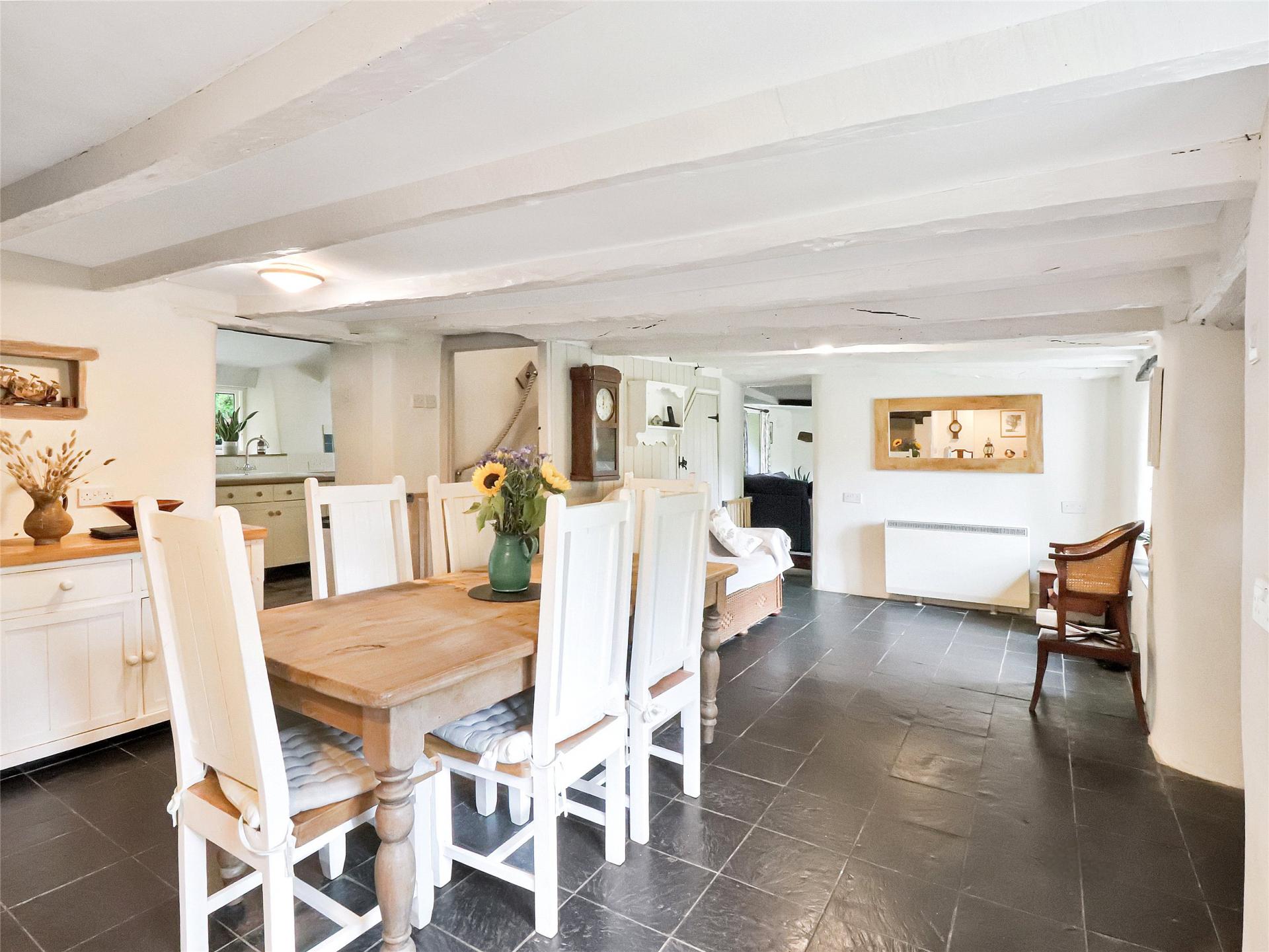 This charming thatched cottage, which, we are advised, is constructed from stone and cob, radiates warmth and homeliness. Behind the front door is an entrance vestibule, perfect for coats and boots, which opens into a spacious beamed breakfast/dining room that immediately captures the character of the home. One end of the room features an inglenook with an oil Rayburn and a former bread oven. Under stairs storage is found on the approach to a double aspect, beamed lounge, measuring approximately 23 foot in length, complete with a log burner in another inglenook fireplace.