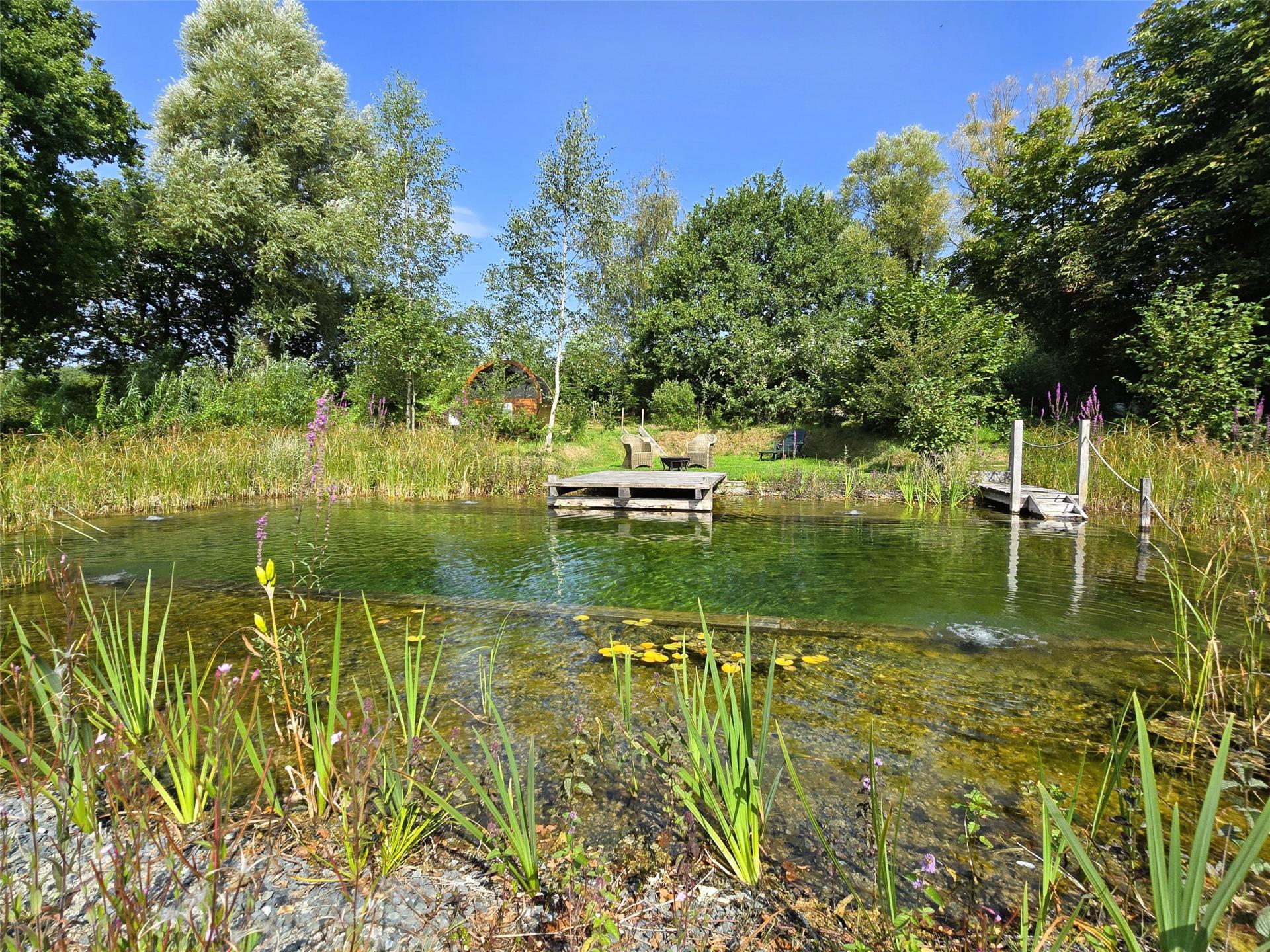 A 45 metre boardwalk illuminated with fairy lights winds through woodland to the natural swimming pool, which enjoys breathtaking views across the Devon countryside to Dartmoor. The pool is rainwater fed, important due to its low nutrient content, and the pool water is continually filtered through planted gravel beds to ensure crystal clear water.
