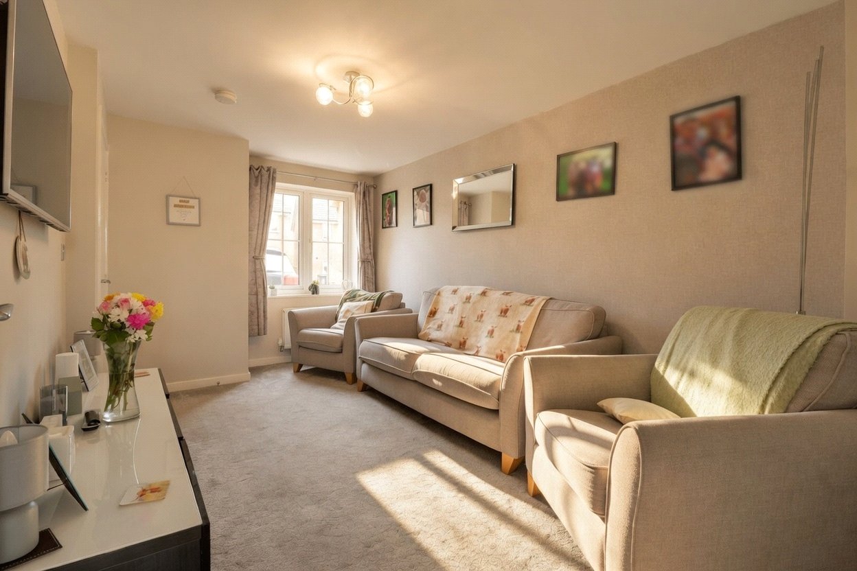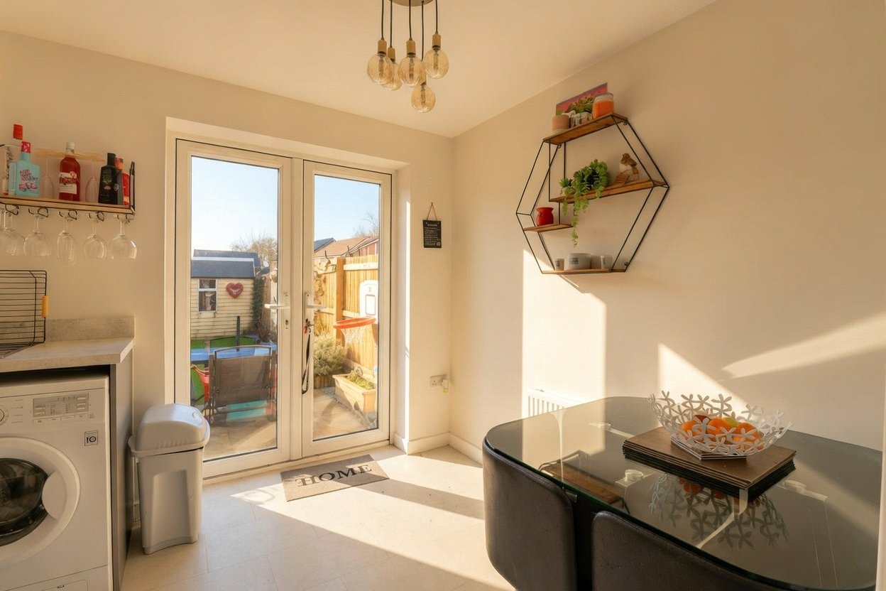 The property is entered via a welcoming hallway, with a downstairs WC. The lounge is positioned at the front of the home, featuring a large window that allows plenty of natural light to fill the room, along with a useful storage cupboard. To the rear, the kitchen/diner is fitted with contemporary units and modern fixtures and fittings, with a built in oven, gas hob with extractor over and space for white goods. The dining area offers ample room for a table and chairs. French doors open directly onto the rear garden, creating a pleasant flow between indoor and outdoor living.