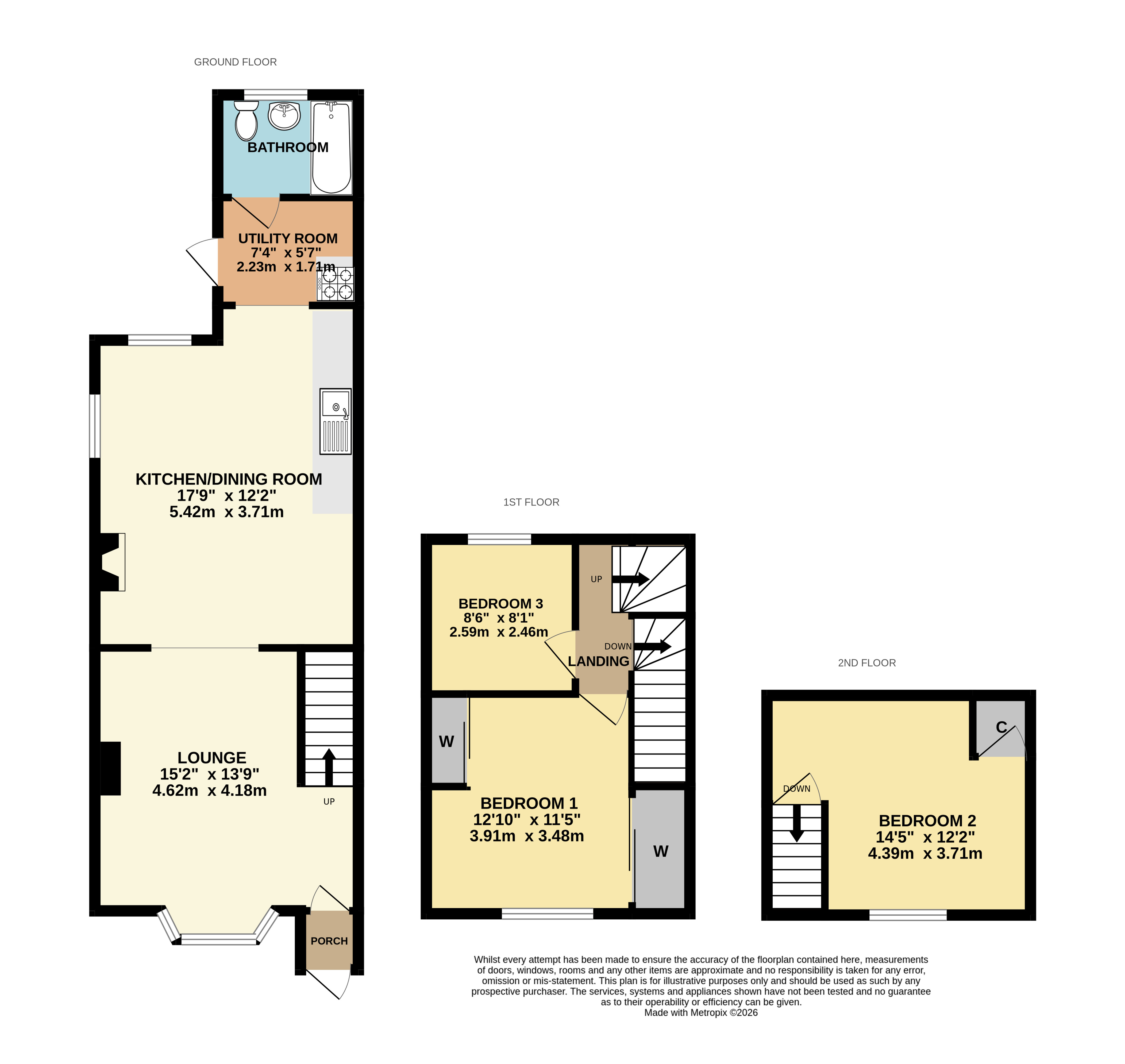 Upon entering the property, you are welcomed into a small porch area which leads through to the main living space. The ground floor is arranged in a semi open-plan style, with an archway separating the lounge from the dining area and kitchen, creating a sociable and versatile layout. The lounge benefits from a bay window to the front, allowing plenty of natural light to fill the room. The dining area and kitchen are well connected, offering worktop space, room for under-counter appliances and a gas-burning stove which adds warmth and character. To the rear, there is a useful utility area providing space for white goods, along with access to the ground floor three-piece suite bathroom. A door from the utility area leads out to the rear garden.