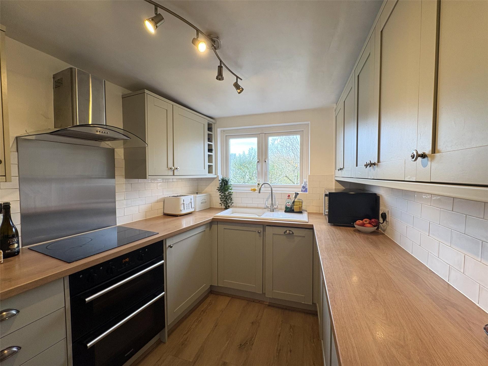 The kitchen is thoughtfully designed with a range of base and wall units, offering practical space for everyday use. A few steps lead down from the dining room to a convenient modern shower room and utility area, with direct access out to the garden.