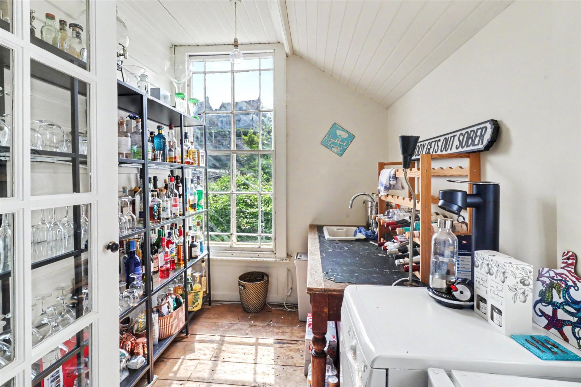 The lower ground floor has been reconfigured as a self contained and generous one double bedroom flat with its own front access, creating a valuable layer of flexibility for income, guest use, or independent occupation by a family member. This floor has been fully redecorated throughout and includes a newly fitted modern kitchen with quartz style worktop, a built in 4 ring gas hob and cooker, and ample storage. There is also a generous lounge diner, a shower room with W C and basin, and a newly fitted utility room with Belfast sink, space for an upright fridge freezer, and space for a washing machine. From this level there is access out to a small patio area, store and wine cellar.