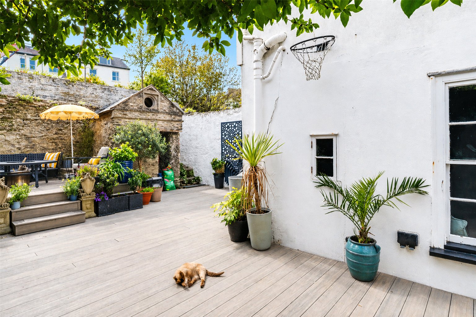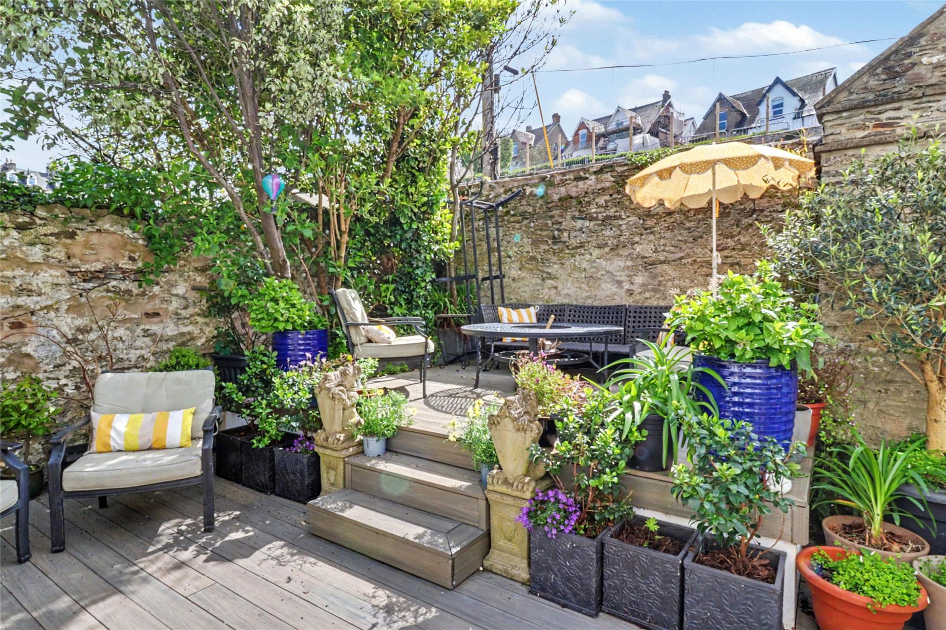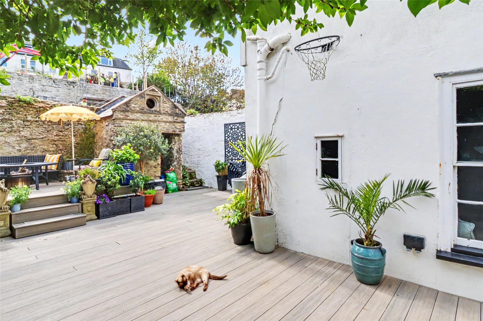 Outside, the rear courtyard garden offers a private and sheltered setting and is now finished with grey composite decking for a smart and low maintenance feel. There is also a lower patio area which is accessible from the lower ground floor, along with a store area and old wine cellar.