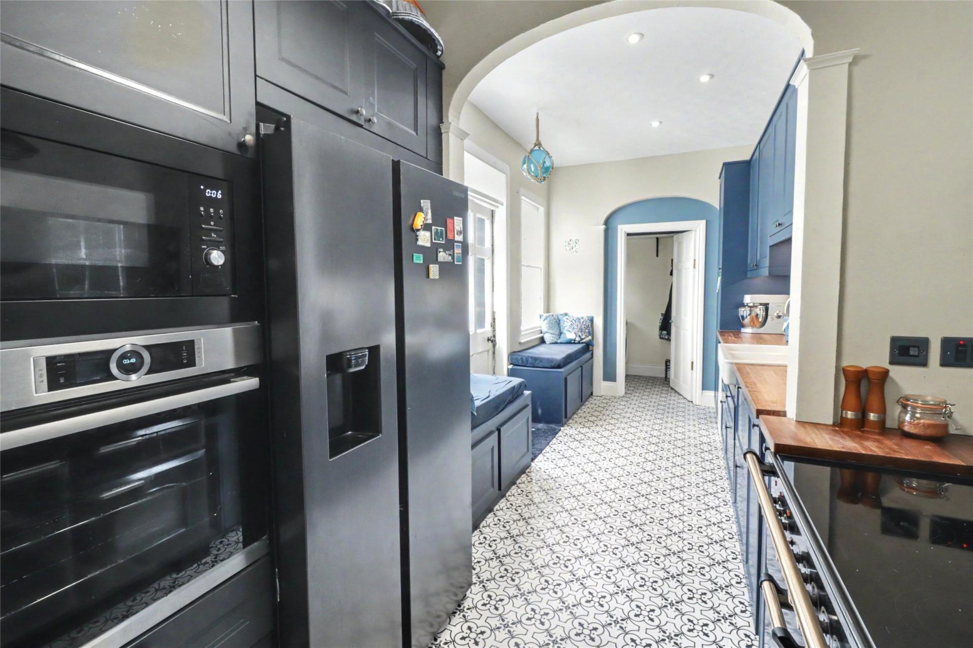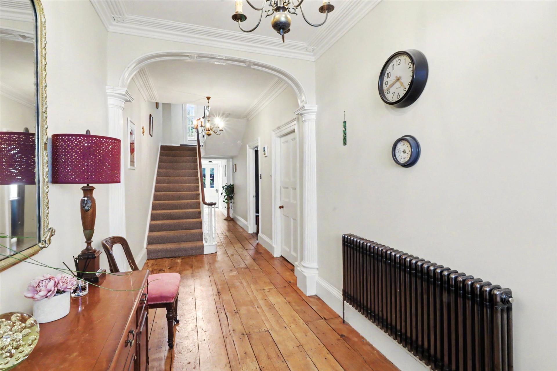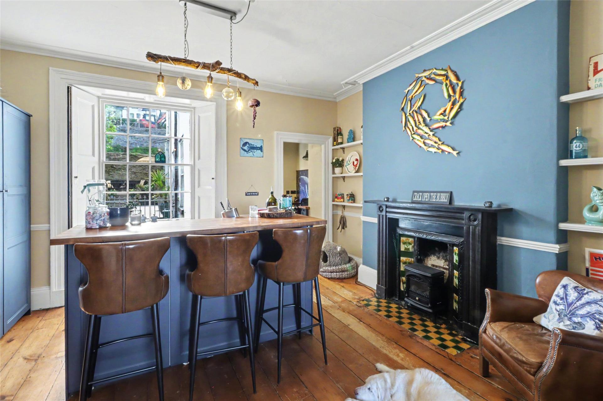The entrance level sets the tone well, with a portico entrance leading into an impressive hall with an ornamental arch supported by columns. From here, the main living space unfolds in a way that feels both gracious and practical. The dining room is a fine period room with a marble slate fireplace, stripped wood flooring and a floor to ceiling sash window framing sea views. The former sitting room is now arranged as a breakfast room with a modern fitted breakfast bar, creating a more informal everyday living space that sits naturally alongside the period fabric of the house.