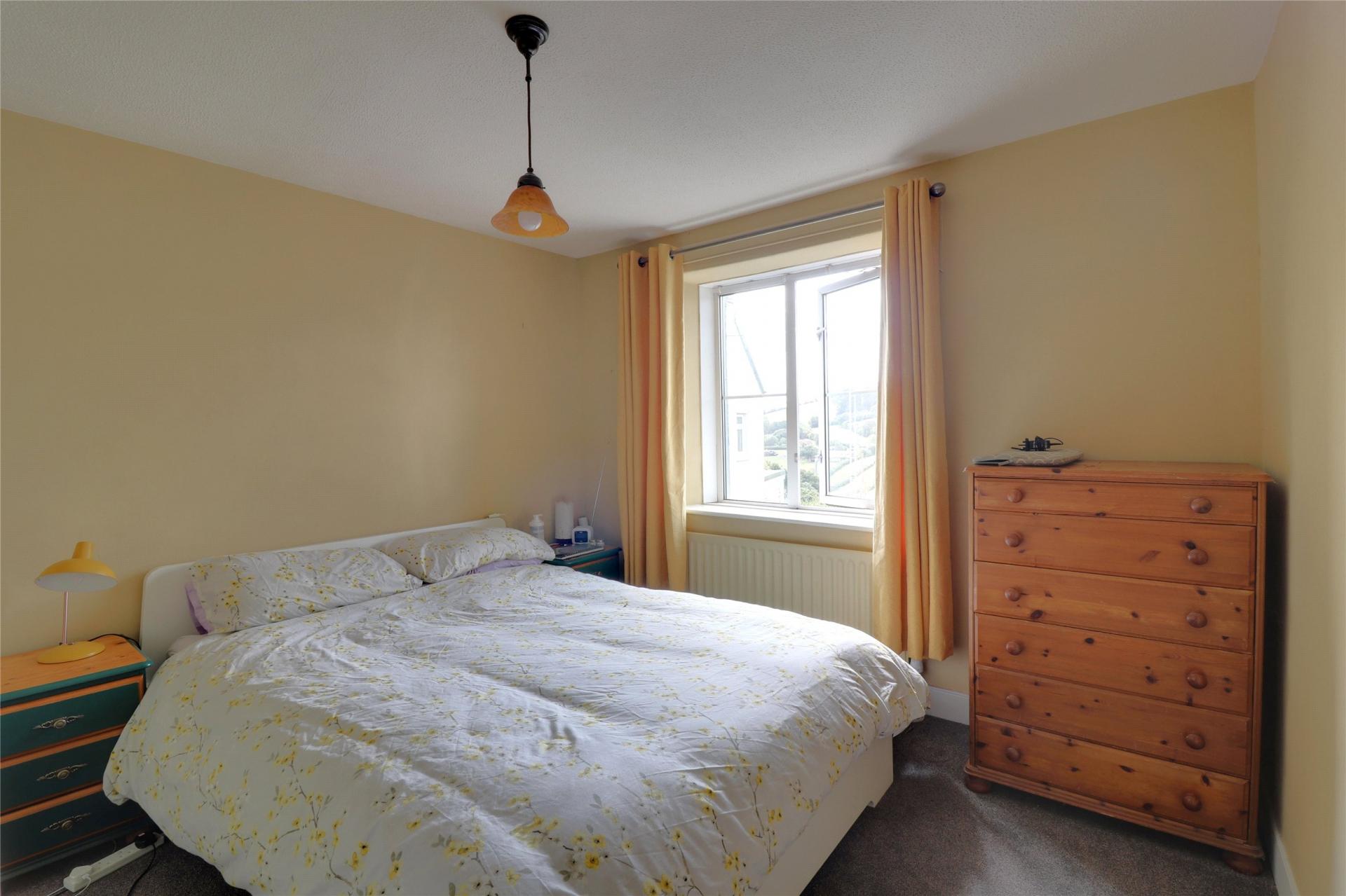 Upstairs, the spacious landing is currently used as a home office, but could be reconfigured into a third bedroom, something the current owners inform us was previously the case. Both bedrooms are generously sized doubles, one with built-in wardrobes and the other with a cleverly designed built-in bed frame over the stairs, making excellent use of space. Each room enjoys far-reaching views across the valley. The modern bathroom serves both bedrooms and includes a panelled bath with shower over, wash basin, and WC.