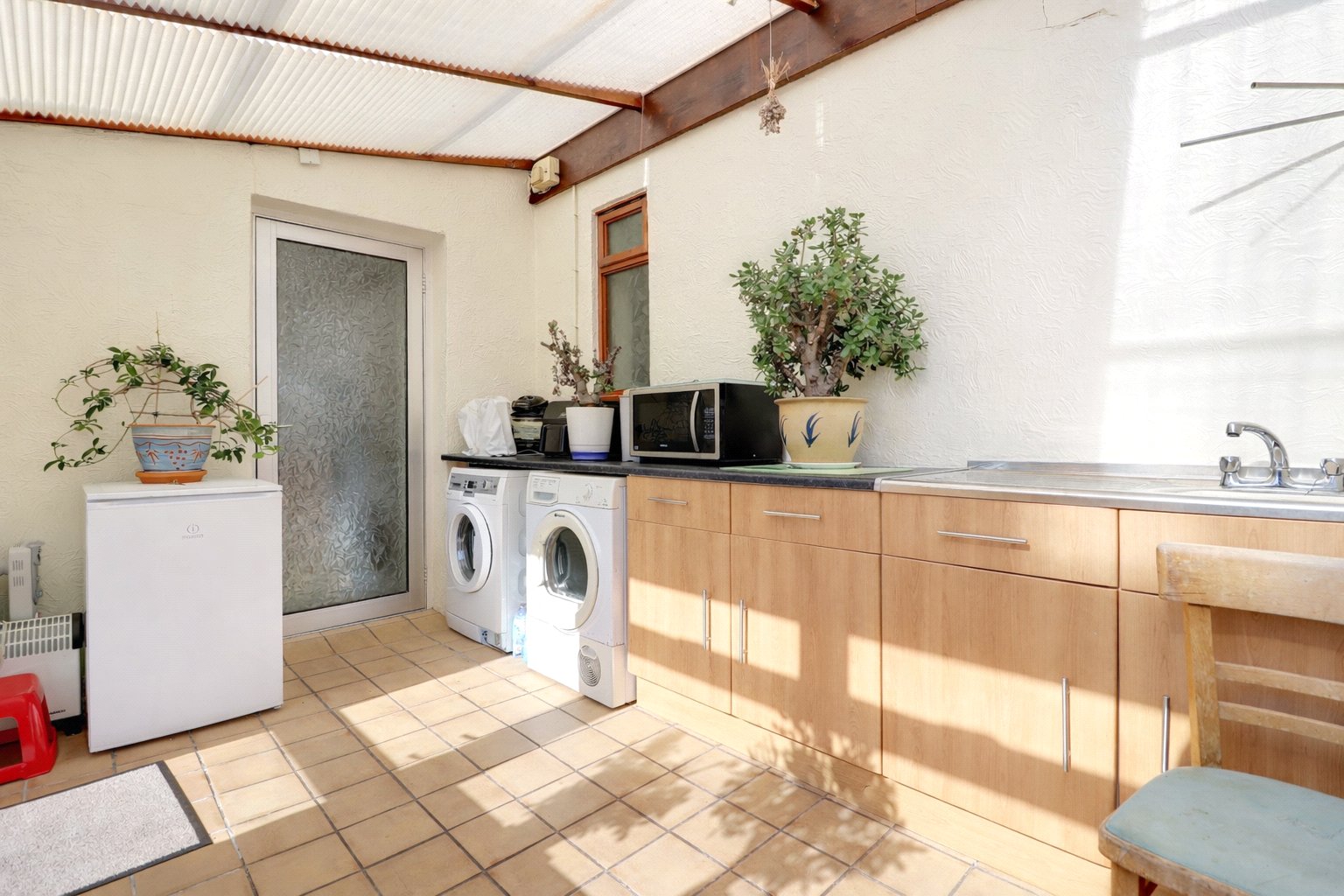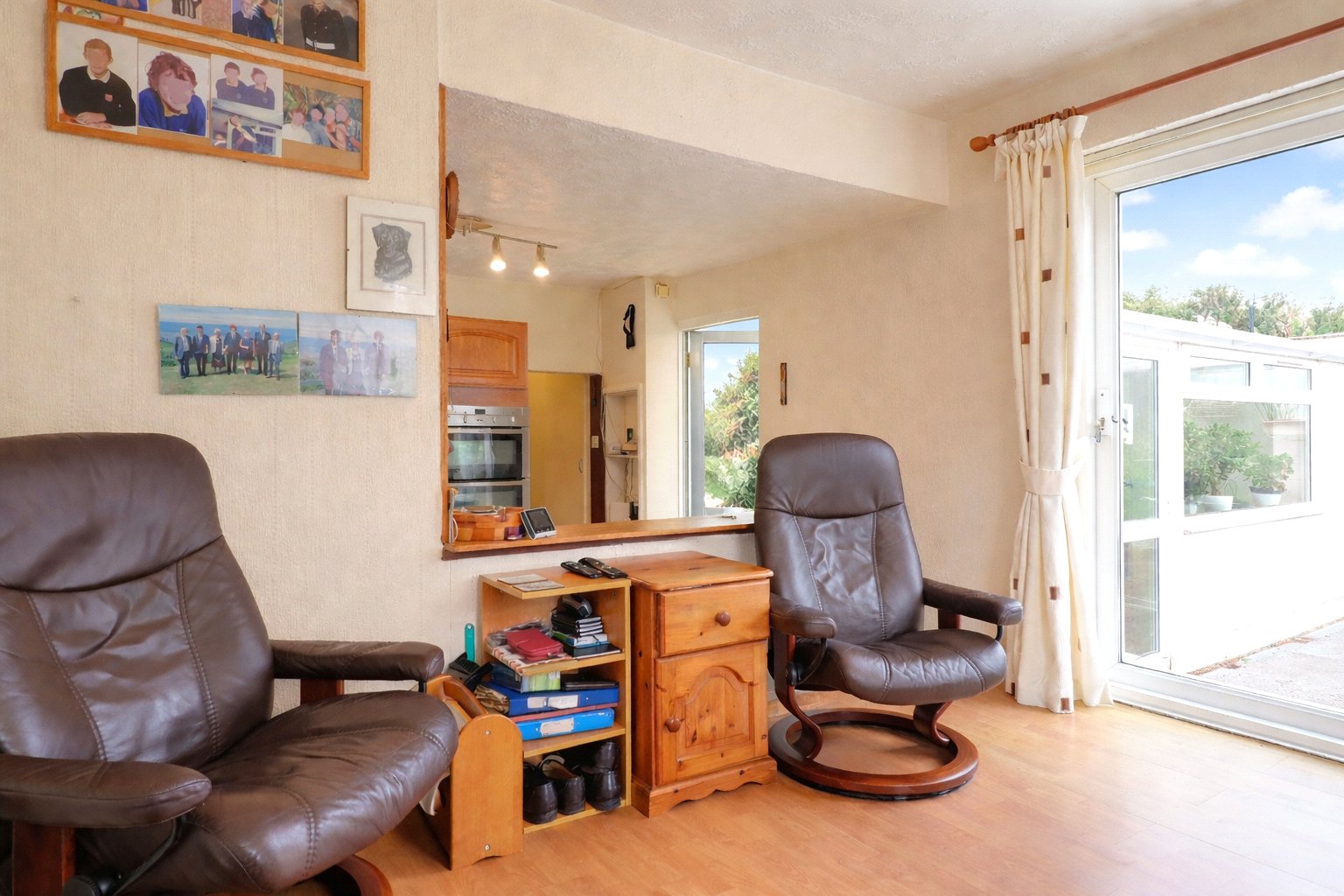The kitchen is fitted with a comprehensive range of traditional oak-style wall and base units, providing ample storage and workspace. Adjoining the kitchen is a versatile dining area, enjoying a pleasant outlook and direct access to the outside via sliding patio doors, making it an ideal everyday living and entertaining space. A door from the kitchen leads through to a useful utility room, offering space for laundry appliances, additional storage and worktop space, with a sink unit already in place. There is also a separate WC and further storage cupboard. This bright and practical area would work equally well as a utility, boot room or general-purpose household space. Tucked away behind a sliding door a flight of stairs lead into the converted attic room. Brightened by two sky lights this room offers a great space for a home office or even an additional occasional bedroom.