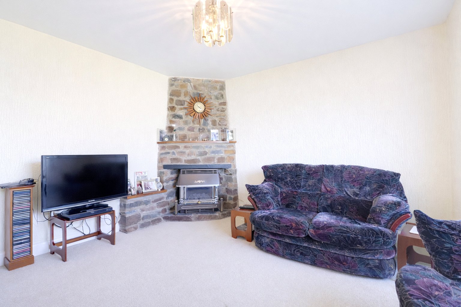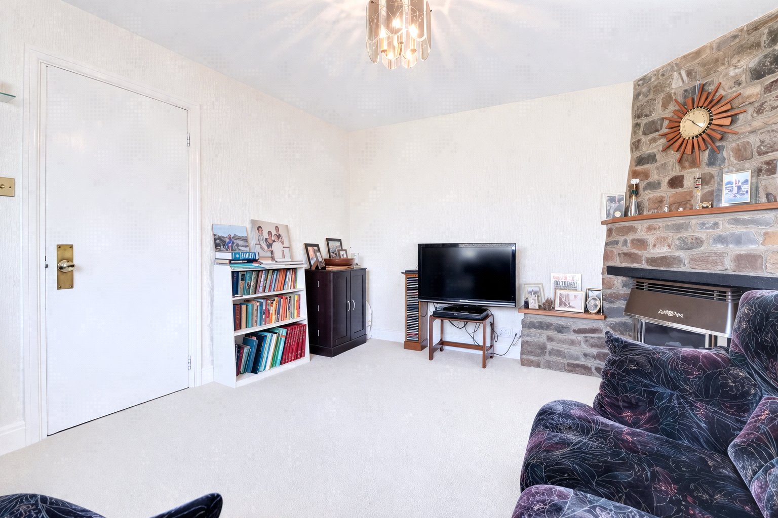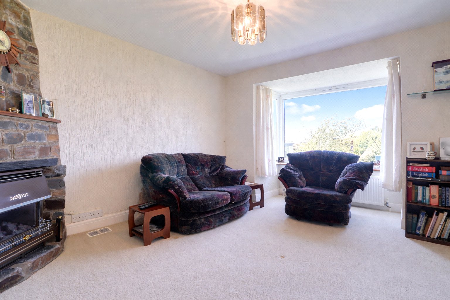 To the right is the sitting room, a comfortable and inviting reception space centred around a characterful stone fireplace, which provides an attractive focal point. A large front-facing window allows plenty of natural light to pour in. Also to the front of the property is a generous double bedroom, complete with fitted wardrobes and a lovely bay window, creating a bright and airy feel. Bedroom two also benefits from fitted wardrobes and an en suite shower room.