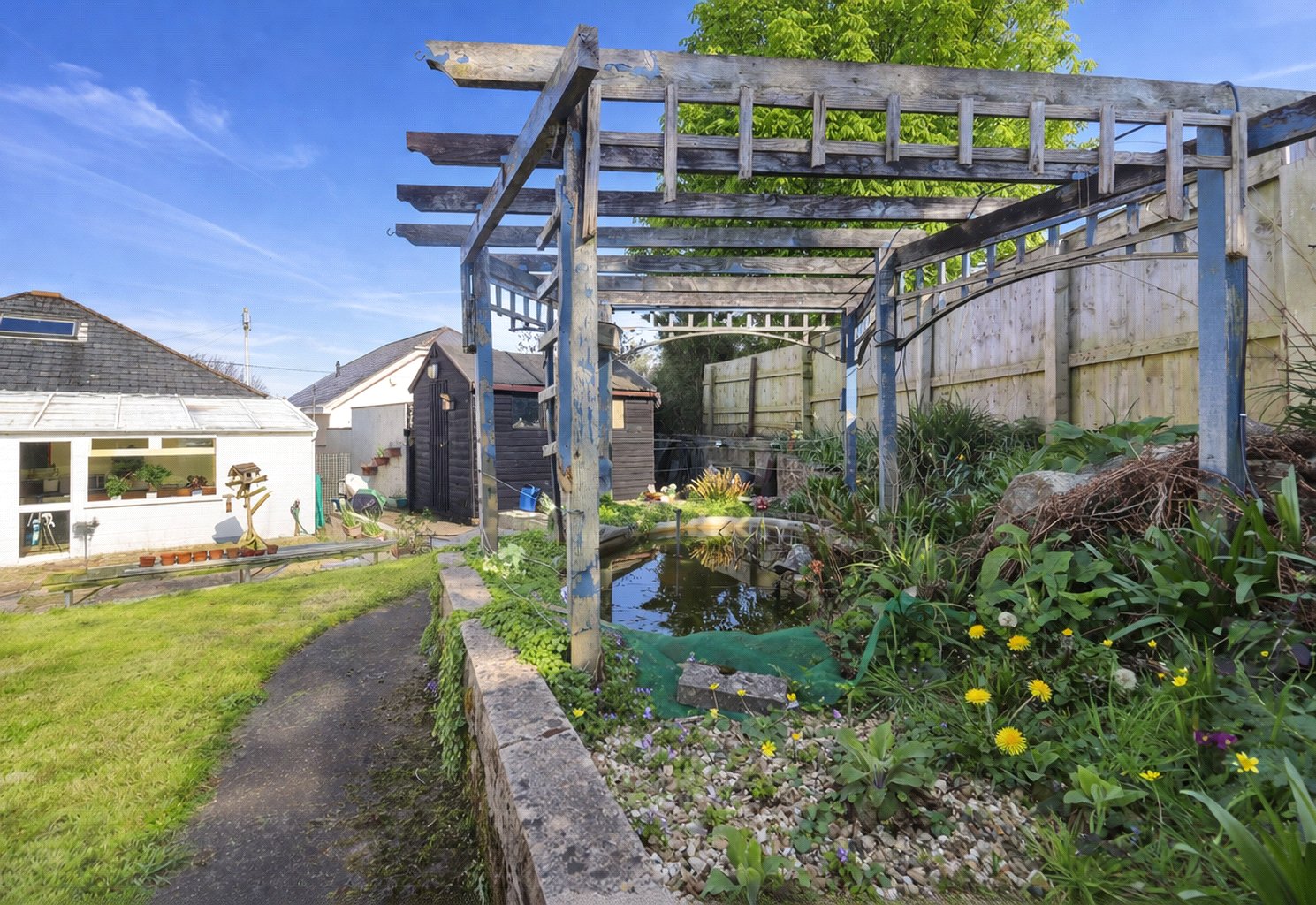 Outside, the property enjoys a delightful rear garden, thoughtfully arranged with paved patio areas, lawn and mature planted borders. A charming pergola and pond add character, while the patio immediately to the rear of the bungalow provides an ideal space for outdoor dining and entertaining. The garden also benefits from useful outbuilding/storage space and offers an attractive setting to enjoy throughout the year.