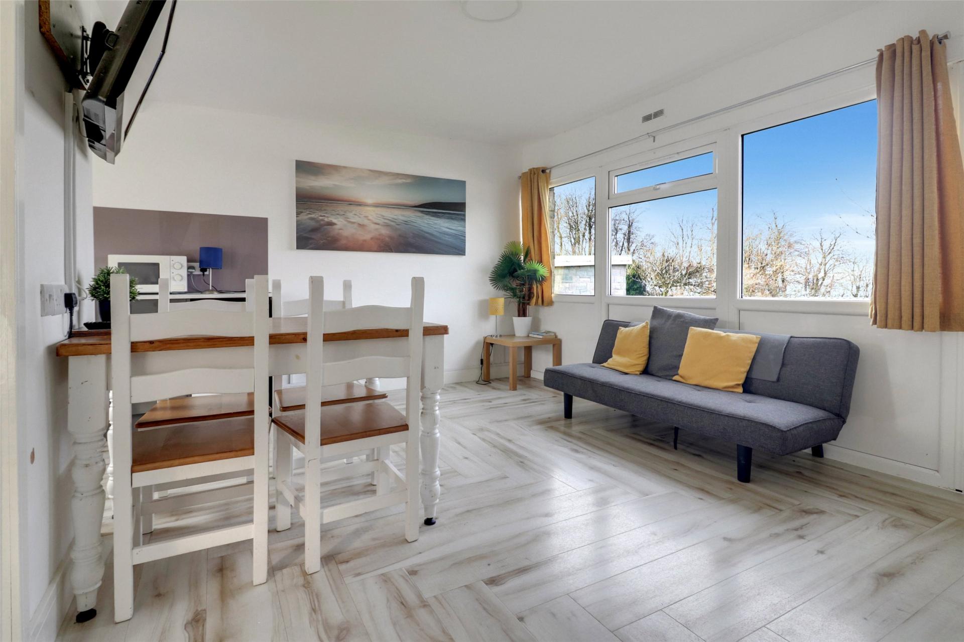 The accommodation has been modernised throughout including an open plan designed lounge / kitchen / dining area with front facing window, overlooking the sea and allowing space for ample furniture. There is a refurbished kitchen comprising of multiple base level gloss units including an inset sink electric oven and separate hob.
