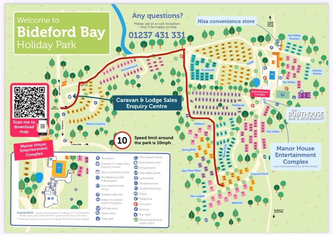 From Bideford Quay, proceed towards the A39 and turn left signposted Hartland and Bude. Continue along this road until reaching Bucks Cross and turn right into Bideford Bay Holiday Park. Upon entering the site follow the road around where the property can be found right at the bottom of the site on the middle row of chalets with the parking area close by.