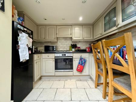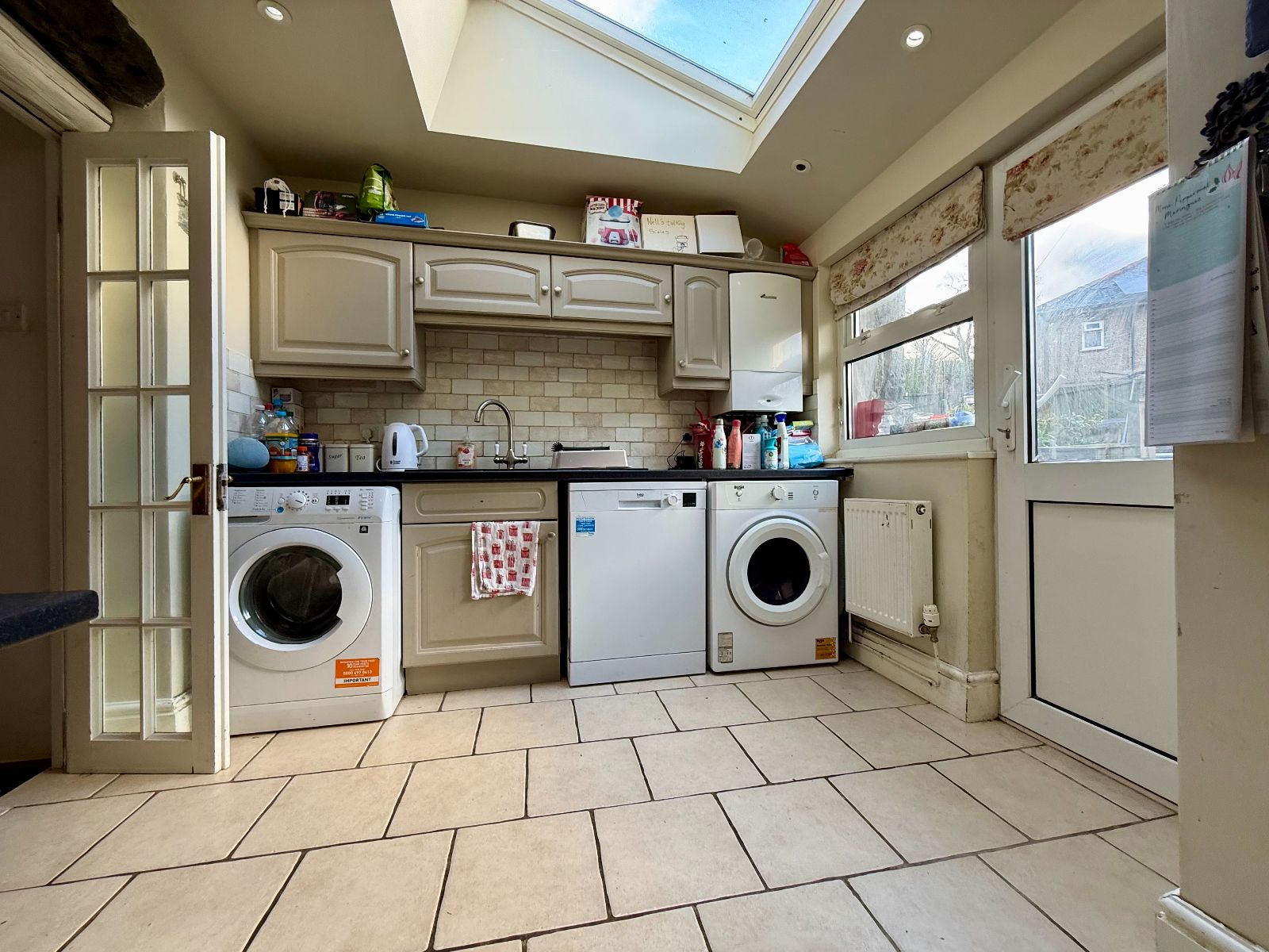 Door and window to rear, large Velux window to rear, ceiling downlights, 12 wall cupboards, 5 base cupboards under a granite effect worktop, tiled splashback, integral oven, 4 ring gas hob with extractor hood above, 1 1/4 composite sink and drainer, space for fridge freezer, space for dish washer, space for automatic washing machine, space for tumble drier, Worcester Bosch combi-boiler, tiled flooring.