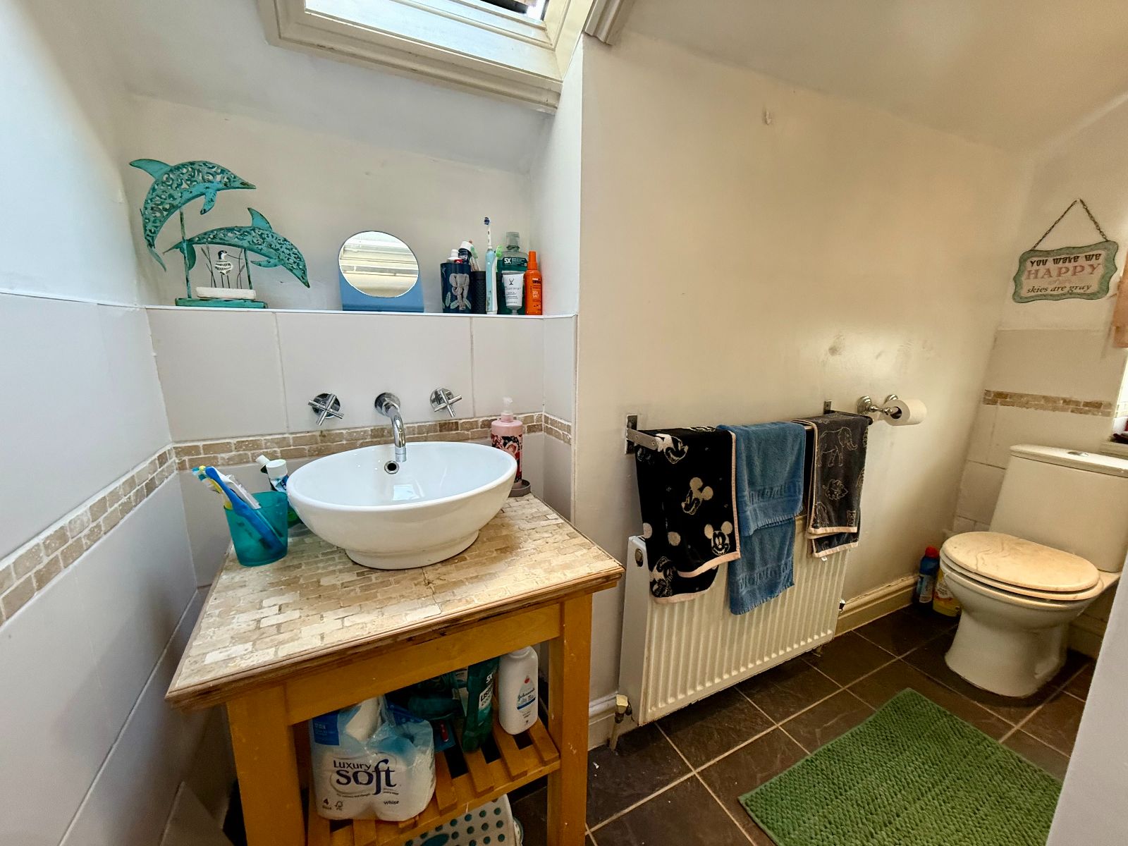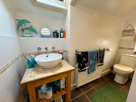Window to rear, Velux to side, extractor fan, ceiling down lights, panelled bath with shower screen and mains shower above, mainly tiled walls, low level W.C., circular wash hand basin, radiator, tiled flooring.