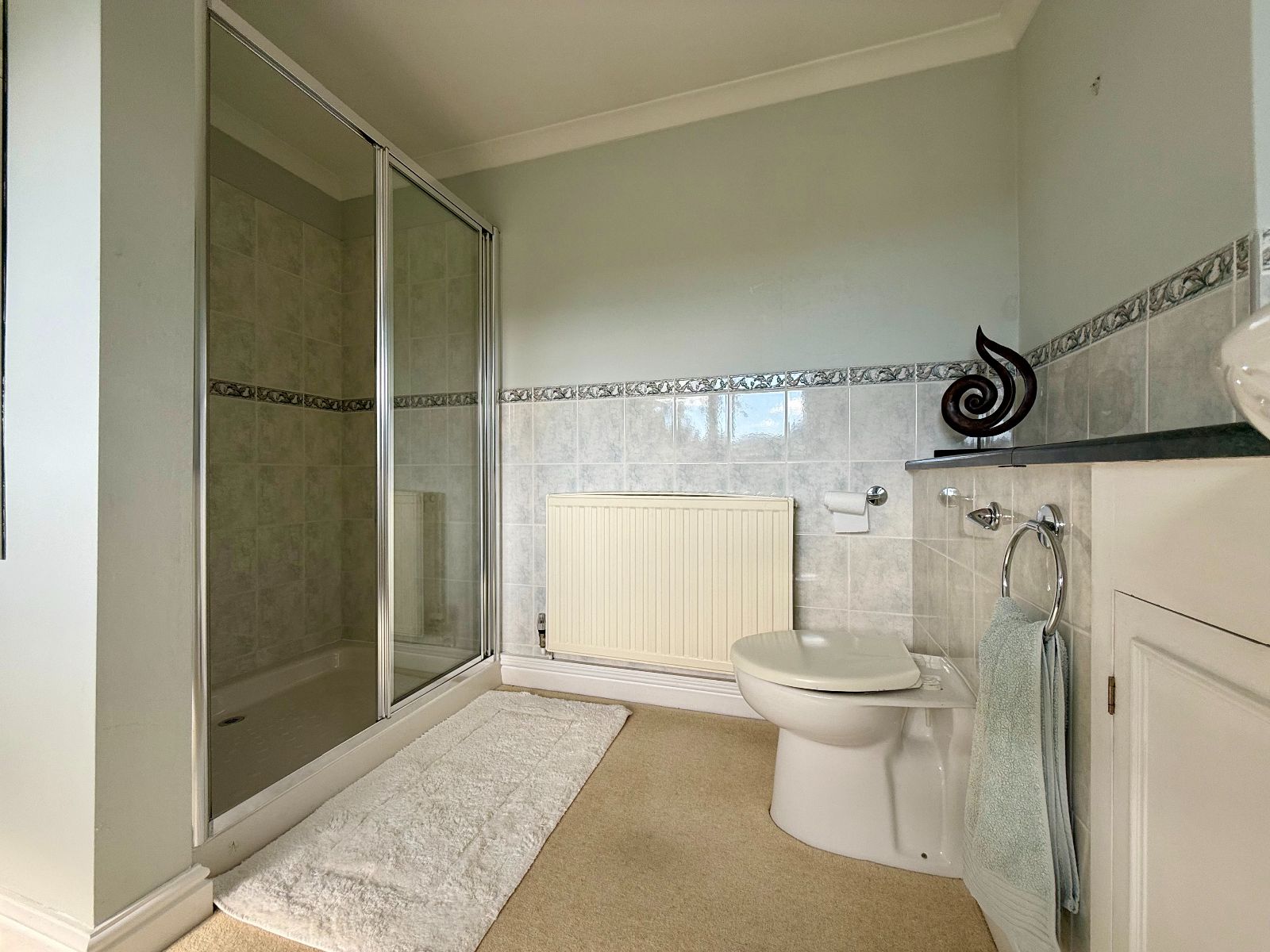 Two high windows to front, panelled bath with mains shower over and shower screen, mainly tiled walls, vanity WC and wash hand basin with mirror and shaver socket and light, heated towel rail/radiator, carpet.