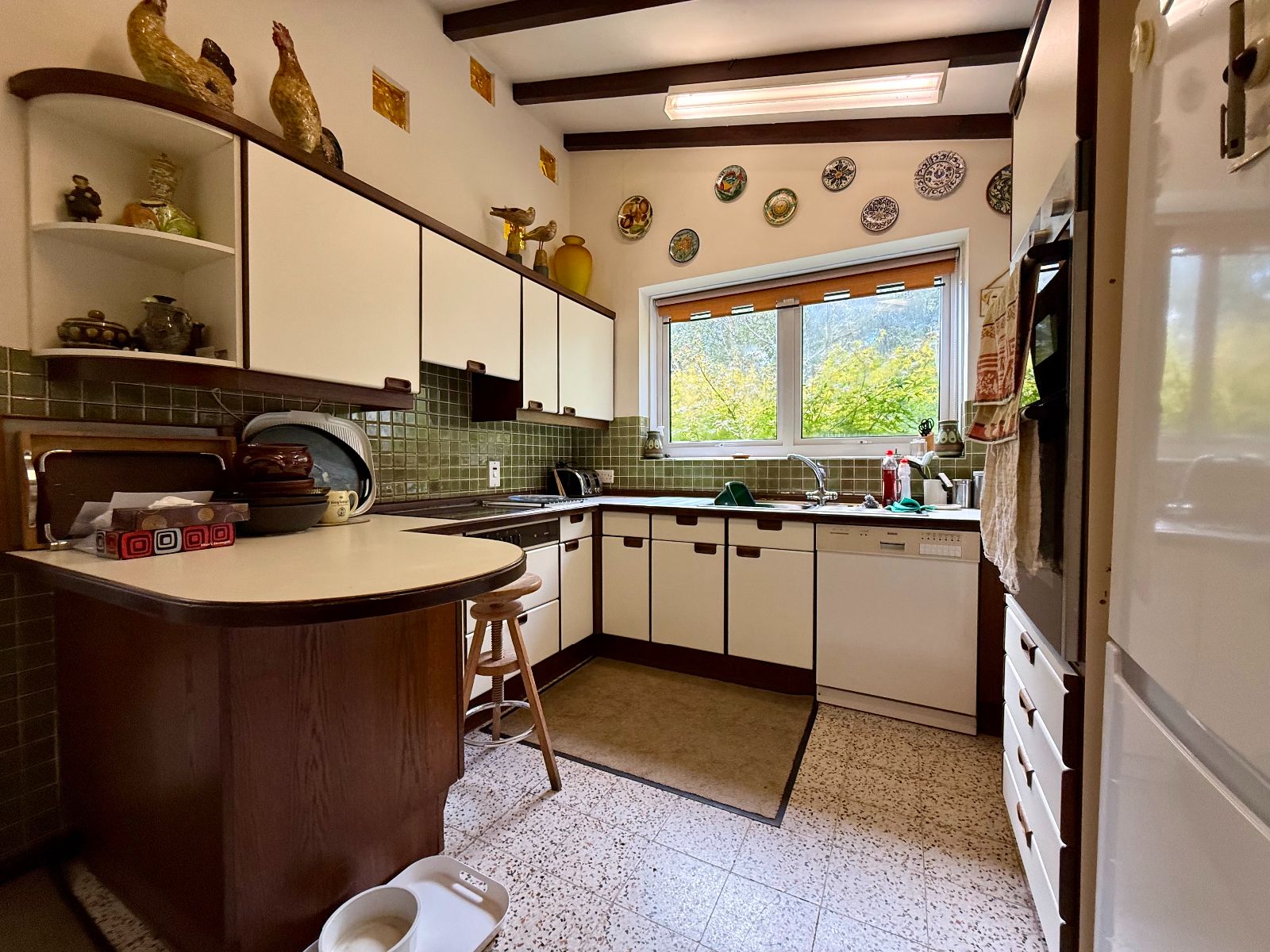 Window to rear, exposed beams, 7 wall units, 9 base units under a laminate worktop, tiled splashback, 4 ring ceramic hob, integral eye level double oven, integral dishwasher, space for fridge freezer, stainless steel sink and drainer, radiator, tiled flooring.