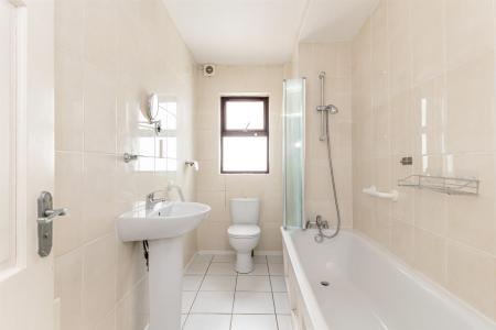 Bathroom: - () - White suite comprising low flush WC, pedestal wash hand basin with chrome mixer tap, panelled bath with chrome mixer tap and telephone hand shower, ceramic tiled floor, fully tiled walls.