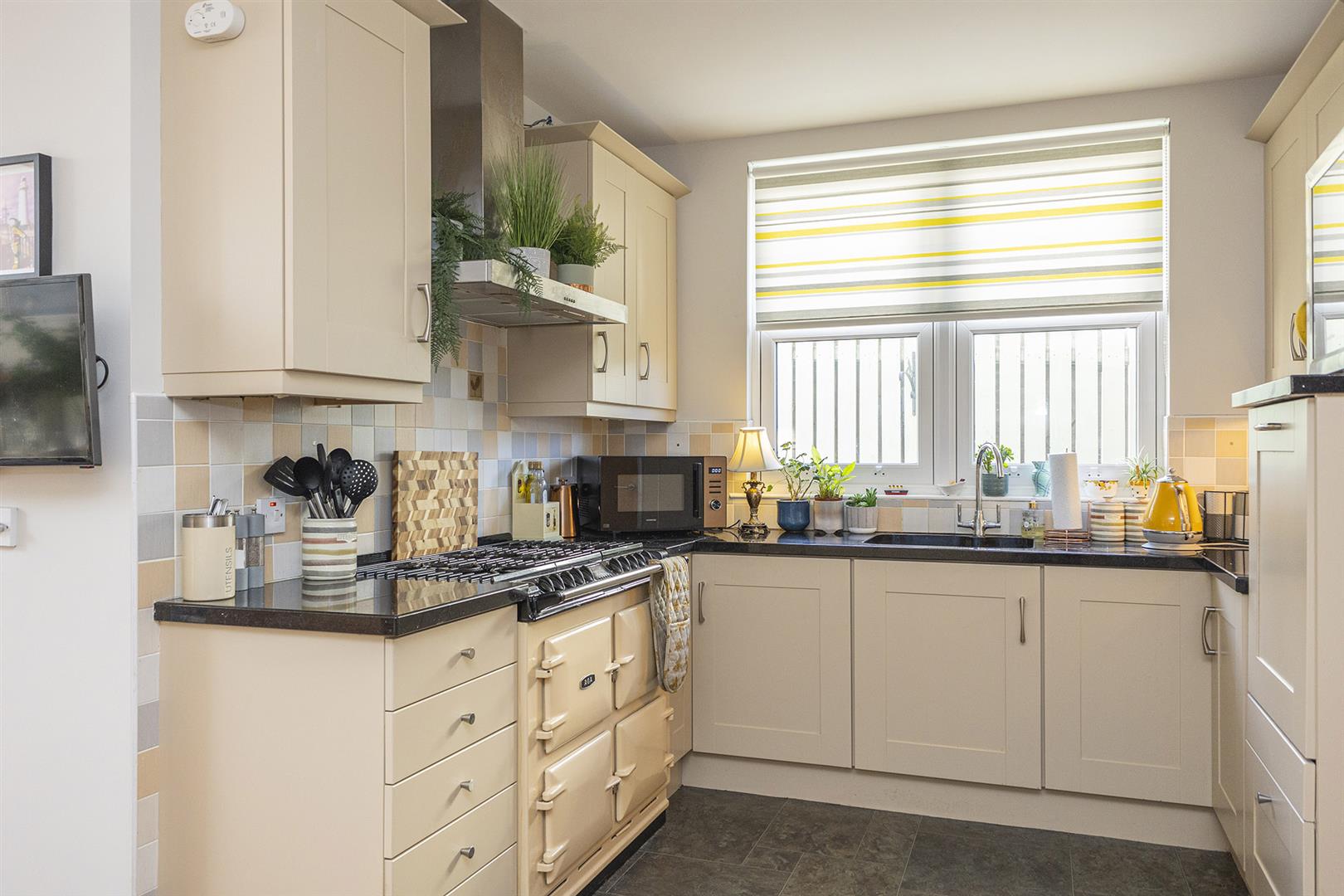 .Superb Fitted Kitchen, with Granite Work Surfaces, which is Open Plan to Casual Dining/Family Area with Feature Vaulted Ceiling, Cast Iron Wood Burning Stove and uPVC Double Glazed French Doors to the Rear