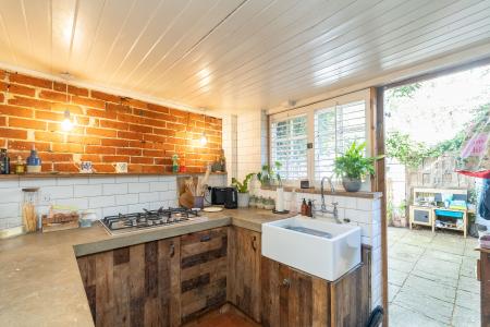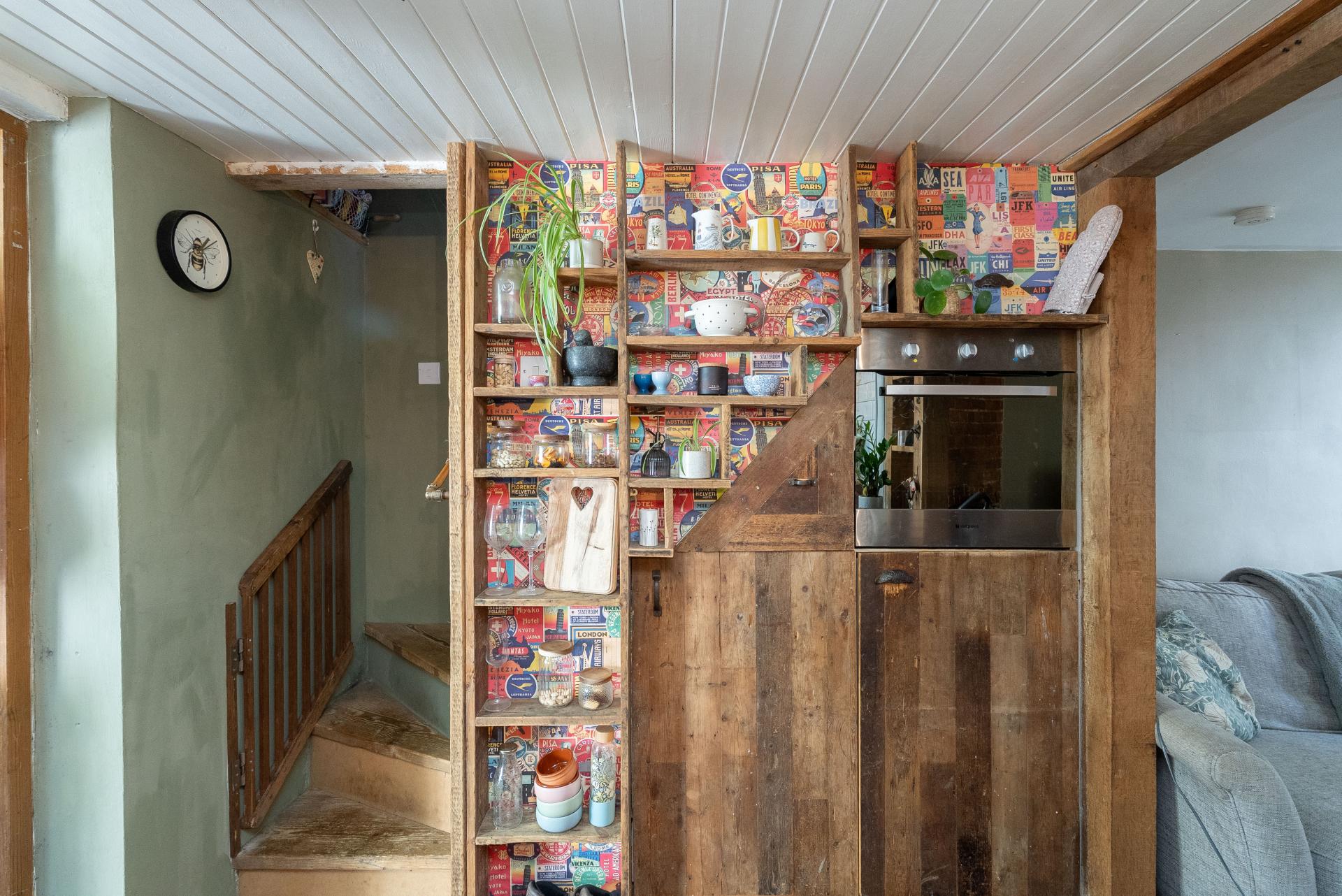 Inside, the cottage is full of personality and thoughtful details. The cosy front-aspect sitting room is a welcoming space, featuring a striking exposed brick fireplace with wood-burning stove perfect for winter evenings. Clever built-in storage maximises the space and a charming archway leads through to the updated kitchen. This bright and well-planned room offers a range of bespoke cabinetry, contemporary concrete worktops and a stable door leading directly to the courtyard garden, allowing light to pour in and creating a lovely flow between indoor and outdoor living.