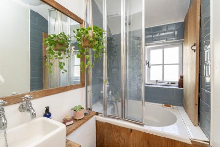 Upstairs, there are two well-presented bedrooms and a family bathroom. The spacious principal bedroom enjoys a front aspect view and is finished with stylish fitted window shutters. The second bedroom overlooks the rear garden and works equally well as a child's room, home office or dressing room. The bathroom is neatly fitted with a white suite, completing the accommodation.