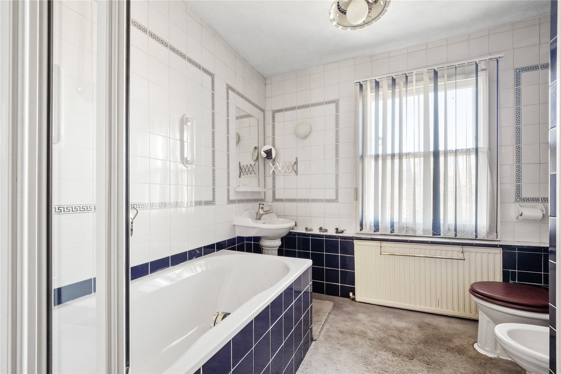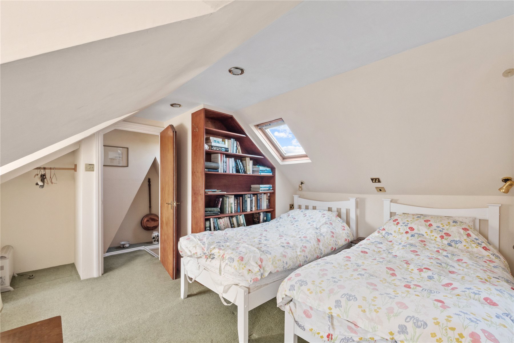 BEDROOM TWO also a double, includes a built-in wardrobe, drawers, and a sash window overlooking the rear. The family BATHROOM has a four-piece suite, including a bathtub with a shower over, a wash hand basin, W.C, and bidet. A heated towel rail and airing cupboard with Viessmann boiler complete the space.